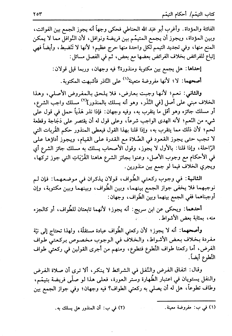 إحداها: هل يجمع بين مكتوبة ومنذورة؟ فيه وجهان، وربما قيل قولان: