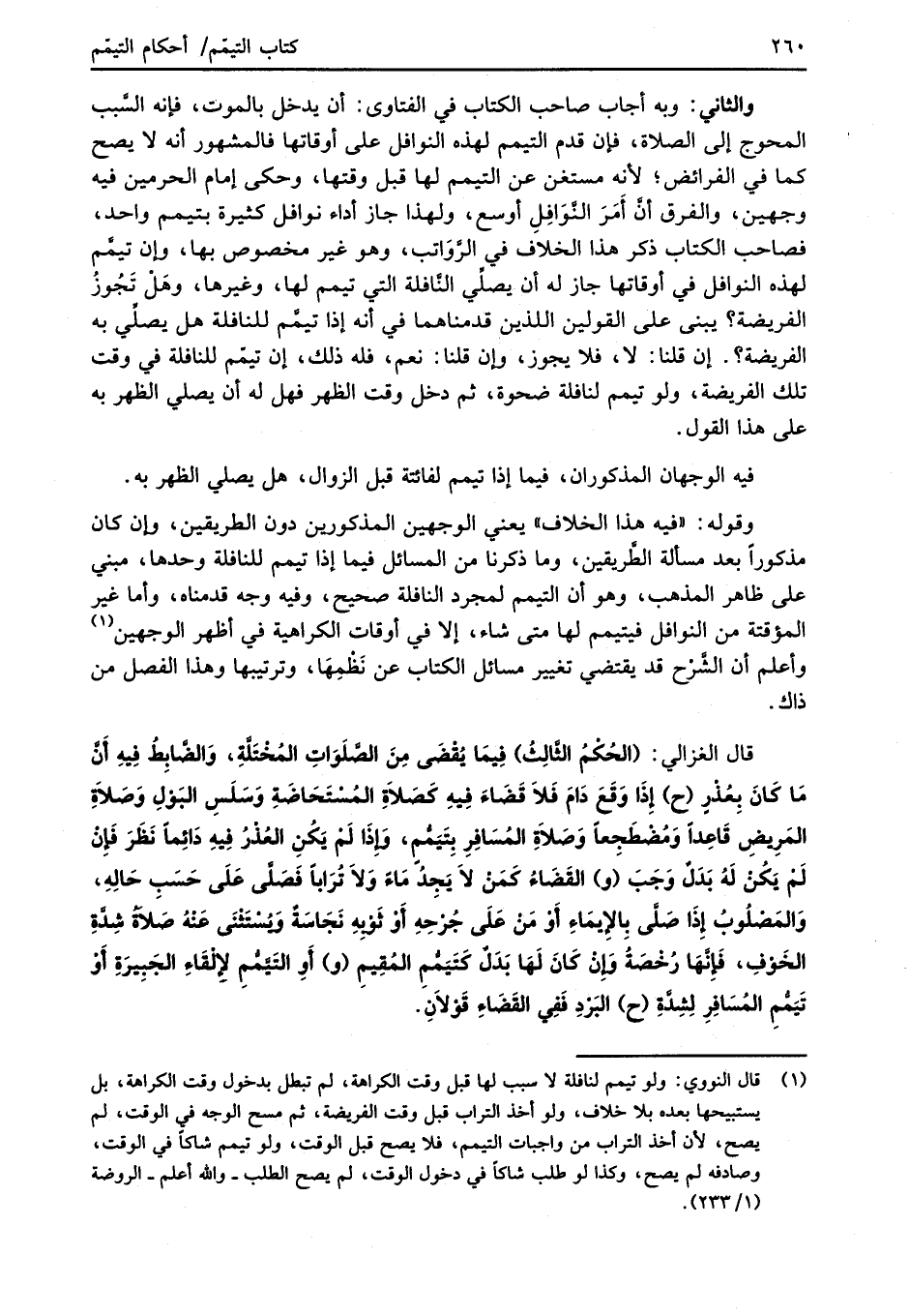 (¬1) قال النووي: ولو تيمم لنافلة لا سبب لها قبل وقت الكراهة، لم تبطل بدخول وقت الكراهة، بل يستبيحها بعده بلا خلاف، ولو أخذ التراب قبل وقت الفريضة، ثم مسح الوجه في الوقت، لم يصح، لأن أخذ التراب من واجبات التّيمم، فلا يصح قبل الوقت، ولو تيمم شاكاً في الوقت، وصادفه لم يصح، وكذا لو طلب شاكاً في دخول الوقت، لم يصح الطلب -والله أعلم- الروضة (1/ 233).