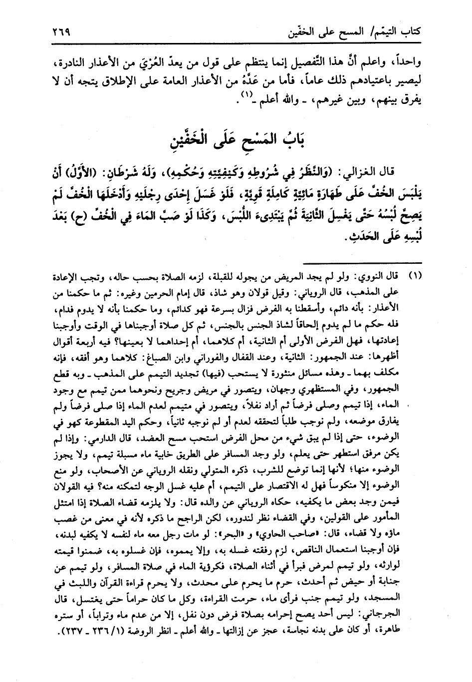قال الغزالي: (وَالنَّظَرُ فِي شُرُوطِهِ وَكَيْفِيَّتِهِ وَحُكْمِهِ)، وَلَهُ شَرْطَانِ: (الأَوَّلُ) أَنْ يَلْبَسَ الخُفَّ عَلَى طَهَارَةٍ مَائِيَّةٍ كَامِلَةٍ قَوِيَّةٍ، فَلَوْ غَسَلَ إِحْدَى رِجْلَيهِ وَأَدْخَلَهَا الْخُفَّ لَمْ يَصِحَّ لُبْسُهُ حَتَّى يَغْسِلَ الثَّانِيَةَ ثُمَّ يَبْتَدِئَ اللُّبْسَ، وَكَذَا لَو صَبَّ المَاءَ فِي الخُفِّ (ح) بَعْدَ لُبْسِهِ عَلَى الحَدَثِ،