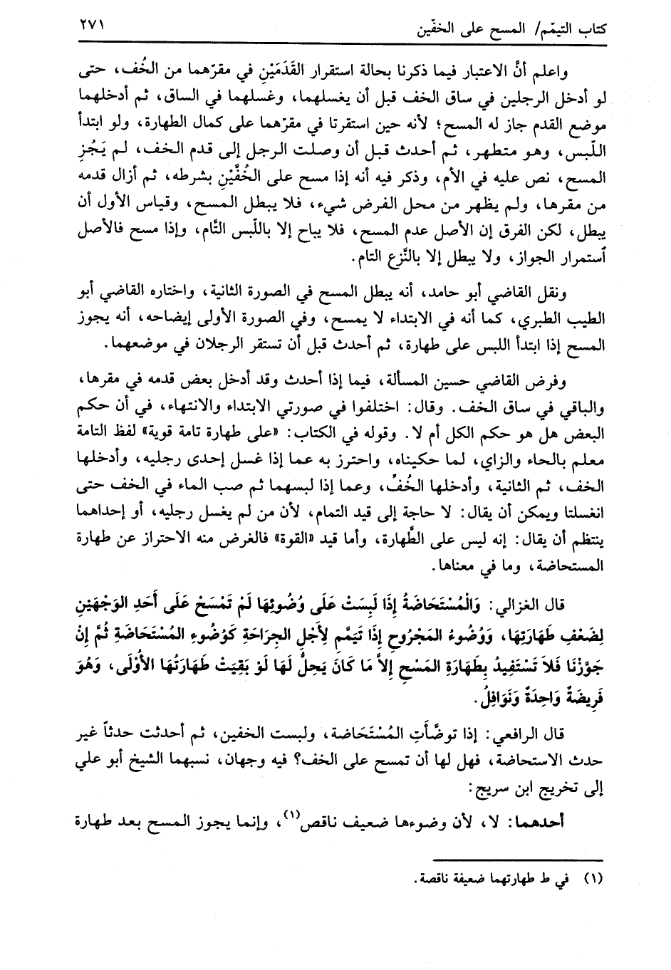قال الغزالي: وَالْمُسْتَحَاضَةُ إِذَا لَبِسَتْ عَلَى وُضُوئِهَا لَمْ تَمْسَحْ عَلَى أَحَدِ الوَجْهَيْنِ لِضَعْفِ طَهَارَتِهَا، وَوُضُوءُ المَجْرُوحِ إِذَا تَيَمَّمِ لِأَجْلِ الجِرَاحَةِ كَوُضُوءِ المُسْتَحَاضَةِ ثُمَّ إِنْ جَوَّزْنَا فَلاَ تَسْتَفِيدُ بِطَهَارَةِ المَسْحِ إلاَّ مَا كانَ يَحِلُّ لَهَا لَوْ بَقِيَتْ طَهَارَتُهَا الأُوْلَى، وَهُوَ فَرِيضَةٌ وَاحِدَةٌ وَنَوَافِلُ.