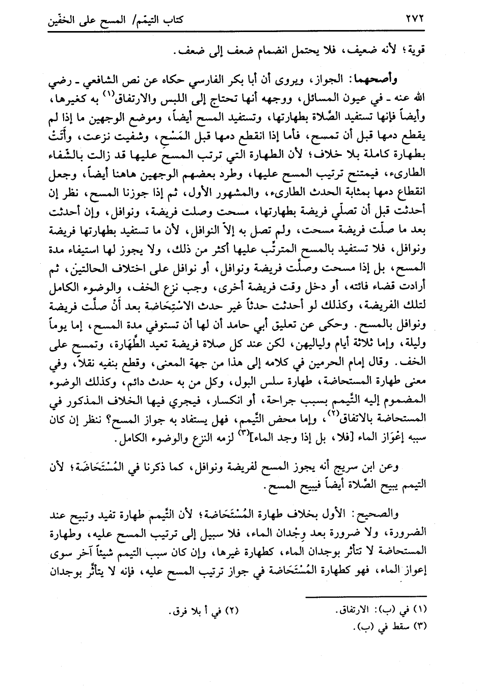 وأصحهما: الجواز، ويروى أن أبا بكر الفارسي حكاه عن نص الشافعي -رضي الله عنه- في عيون المسائل، ووجهه أنها تحتاج إلى اللبس والارتفاق (¬1) به كغيرها، وأيضاً فإنها تستفيد الصَّلاة بطهارتها، وتستفيد المسح أيضاً، وموضع الوجهين ما إذا لم يقطع دمها قبل أن تمسح، فأما إذا انقطع دمها قبل المَسْحِ، وشفيت نزعت، وأَتَتْ بطهارة كاملة بلا خلاف؛ لأن الطهارة التي ترتب المسح عليها قد زالت بالشّفاء الطارئ، فيمتنح ترتيب المسح عليها، وطرد بعضهم الوجهين هاهنا أيضاً، وجعل انقطاع دمها بمثابة الحدث الطارئ، والمشهور الأول، ثم إذا جوزنا المسح، نظر إن أحدثت قبل أن تصلّي فريضة بطهارتها، مسحت وصلت فريضة، ونوافل، وإن أحدثت بعد ما صلّت فريضة مسحت، ولم تصل به إلاّ النوافل، لأن ما تستفيد بطهارتها فريضة ونوافل، فلا تستفيد بالمسح المترتِّب عليها أكثر من ذلك، ولا يجوز لها استيفاء مدة المسح، بل إذا مسحت وصلت فريضة ونوافل، أو نوافل على اختلاف الحالتين، ثم أرادت قضاء فائته، أو دخل وقت فريضة أخرى، وجب نزع الخف، والوضوء الكامل لتلك الفريضة، وكذلك لو أحدثت حدثاً غير حدث الاستِحَاضة بعد أَنْ صلَّت فريضة ونوافل بالمسح. وحكى عن تعليق أبي حامد أن لها أن تستوفي مدة المسح، إما يوماً وليلة، وإما ثلاثة أيام ولياليهن، لكن عند كل صلاة فريضة تعيد الطَّهَارة، وتمسح على الخف. وقال إمام الحرمين في كلامه إلى هذا من جهة المعنى، وقطع بنفيه نقلاً، وفي معنى طهارة المستحاضة، طهارة سلس البول، وكل من به حدث دائم، وكذلك الوضوء المضموم إليه التَّيمم بسبب جراحة، أو انكسار، فيجري فيها الخلاف المذكور في المستحاضة بالاتفاق (¬2)، وإما محض التَّيمم، فهل يستفاد به جواز المسح؟ ننظر إن كان سببه إعْوَاز الماء [فلا، بل إذا وجد الماء] (¬3) لزمه النزع والوضوء الكامل.