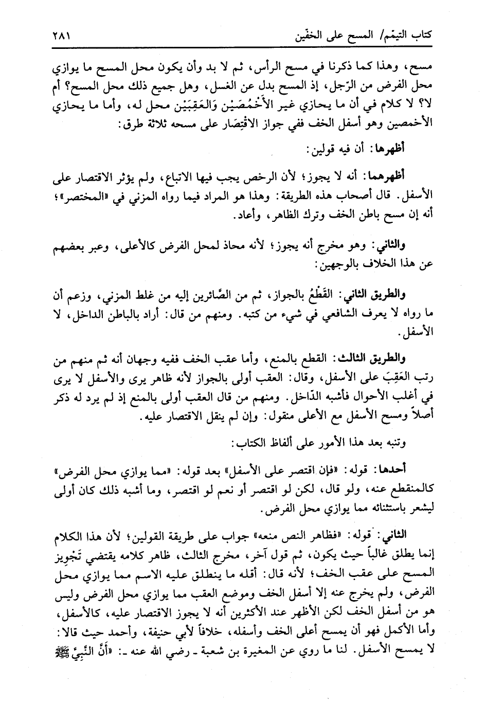 الثاني: قوله: "فظاهر النص منعه" جواب على طريقة القولين؛ لأن هذا الكلام إنما يطلق غالباً حيث يكون، ثم قول آخر، مخرج الثالث، ظاهر كلامه يقتضي تَجْوِيز المسح على عقب الخف؛ لأنه قال: أقله ما ينطلق عليه الاسم مما يوازي محل الفرض، ولم يخرج عنه إلا أسفل الخف وموضع العقب مما يوازي محل الفرض وليس هو من أسفل الخف لكن الأظهر عند الأكثرين أنه لا يجوز الاقتصار عليه، كالأسفل، وأما الأكمل فهو أن يمسح أعلى الخف وأسفله، خلافاً لأبي حنيفة، وأحمد حيث قالا: لا يمسح الأسفل. لنا ما روي عن المغيرة بن شعبة -رضي الله عنه-: "أَنَّ النَّبِيَّ -صلى الله عليه وسلم-