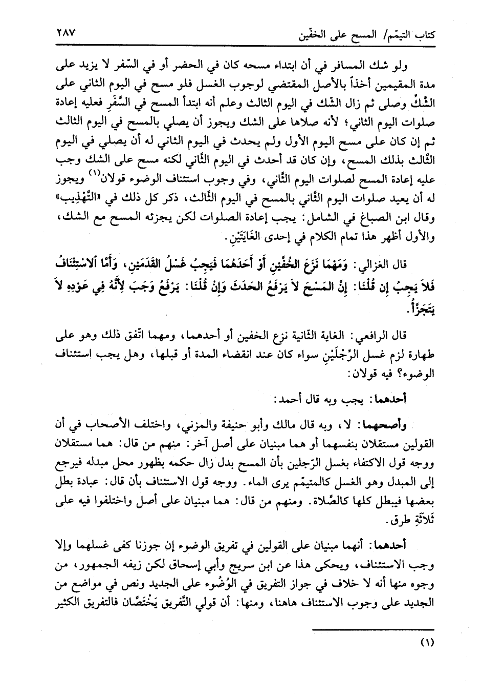 وأصحهما: لا، وبه قال مالك وأبو حنيفة والمزني، واختلف الأصحاب في أن القولين مستقلان بنفسهما أو هما مبنيان على أصل آخر: منهم من قال: هما مستقلان ووجه قول الاكتفاء بغسل الرّجلين بأن المسح بدل زال حكمه بظهور محل مبدله فيرجع إلى المبدل وهو الغسل كالمتيمّم يرى الماء. ووجه قول الاستئّناف بأن قال: عبادة بطل بعضها فيبطل كلها كالصَّلاة. ومنهم من قال: هما مبنيان على أصل واختلفوا فيه على ثَلاَثَةِ طرق.