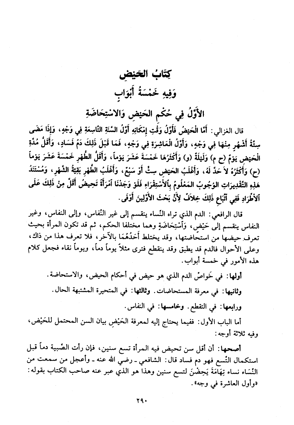 قال الرافعي: الدم الذي تراه النِّساء ينقسم إلى غير النِّفاس، وإلى النفاس، وغير النفاس ينقسم إلى حَيْضٍ، وَاسْتِحَاضَةٍ وهما مختلفا الحكم، ثم قد تكون المرأة بحيث تعرف حيضها من استحاضتها، وقد يختلط أَحَدُهُمَا بالآخر، فلا تعرف هذا من ذاك، وعلى الأحوال فالدم قد يطبق وقد ينقطع فترى مثلاً يوماً دماً، ويوماً نقاء فجعل كلام هذه الأمور في خمسة أبواب.