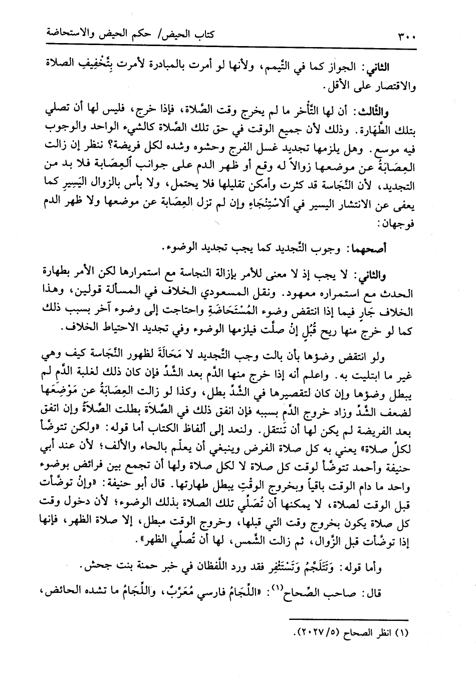 والثاني: لا يجب إذ لا معنى للأمر بإزالة النجاسة مع استمرارها لكن الأمر بطهارة الحدث مع استمراره معهود. ونقل المسعودي الخلاف في المسألة قولين، وهذا الخلاف جَارٍ فيما إذا انتقض وضوء المُسْتَحَاضَةِ واحتاجت إلى وضوء آخر بسبب ذلك كما لو خرج منها ريح قُبُل إنْ صلَّت فيلزمها الوضوء وفي تجديد الاحتياط الخلاف.