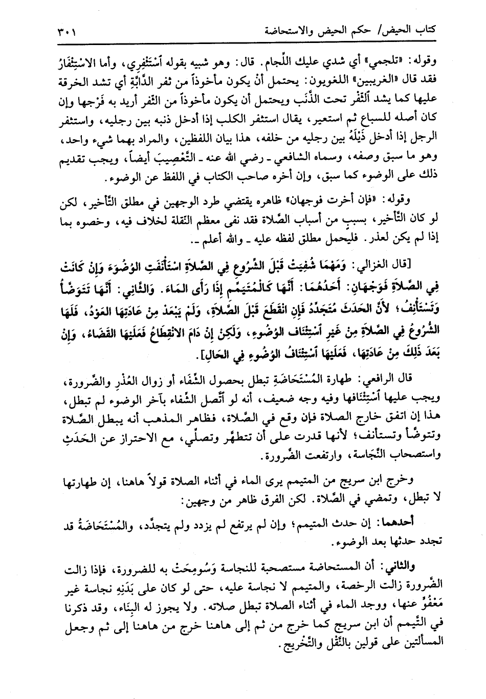 وقوله: "تلجمي" أي شدي عليك اللِّجام. قال: وهو شبيه بقوله اسْتثْفِرِي، وأما الاسْتِثْفَارُ فقد قال "الغريبين" اللغويون: يحتمل أنْ يكون مأخوذاً من ثفر الدَّابَّةِ أي تشد الخرقة عليها كما يشد الثّفْر تحت الذَّنَب ويحتمل أن يكون مأخوذًا من الثّفر أريد به فَرْجها وإن كان أصله للسباع ثم استعير، يقال استثفر الكلب إذا أدخل ذنبه بين رجليه، واستثفر الرجل إذا أدخل ذَيْلَهُ بين رجليه من خلفه، هذا بيان اللفظين، والمراد بهما شيء واحد، وهو ما سبق وصفه، وسماه الشافعي -رضي الله عنه- التَّعْصِيبَ أيضاً، ويجب تقديم ذلك على الوضوء كما سبق، وإن آخره صاحب الكتاب في اللفظ عن الوضوء.
