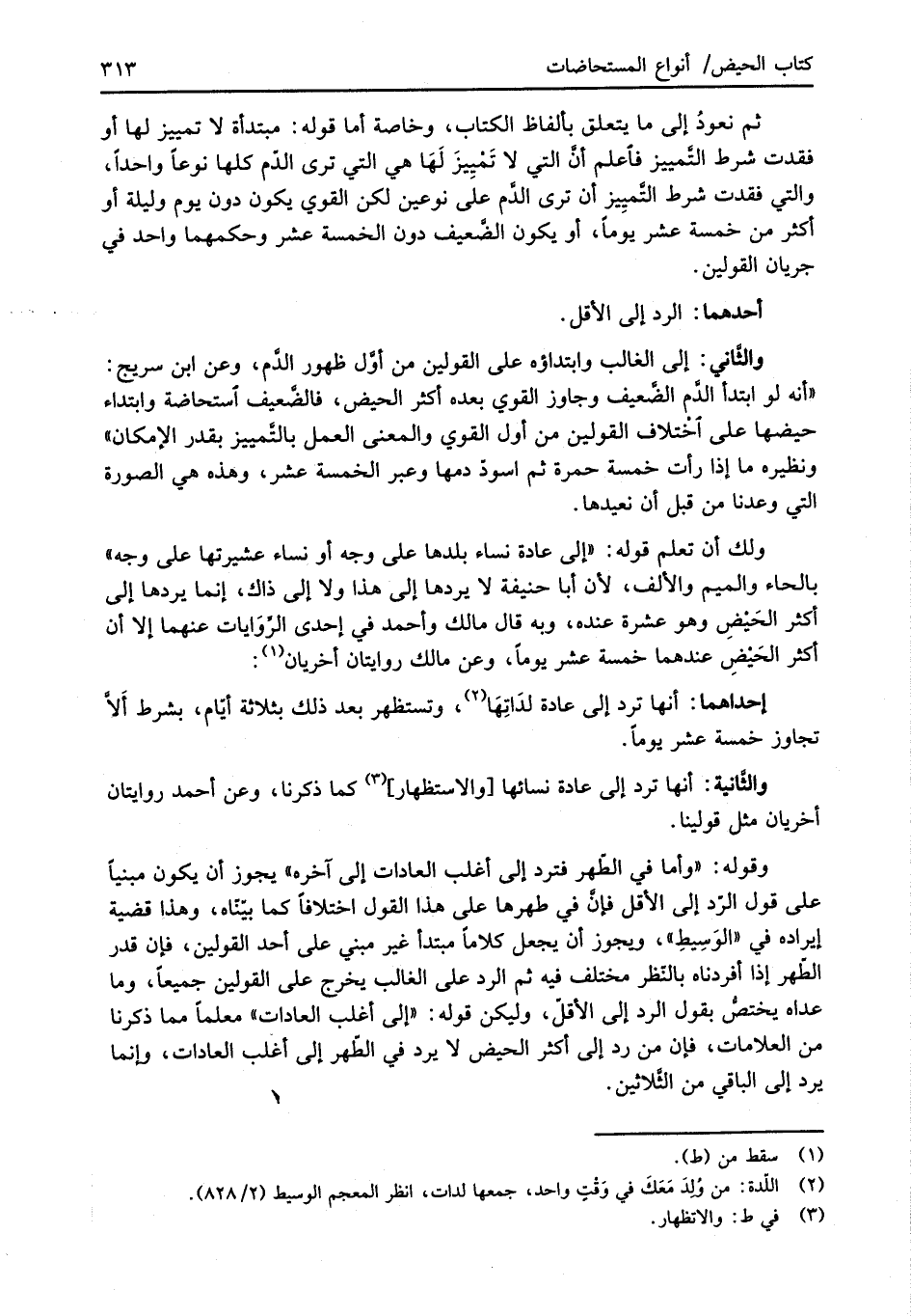 ولك أن تعلم قوله: "إلى عادة نساء بلدها على وجه أو نساء عشيرتها على وجه" بالحاء والميم والألف، لأن أبا حنيفة لا يردها إلى هذا ولا إلى ذاك، إنما يردها إلى أكثر الحَيْضِ وهو عشرة عنده، وبه قال مالك وأحمد في إحدى الرِّوَايات عنهما إلا أن أكثر الحَيْضِ عندهما خمسة عشر يوماً، وعن مالك روايتان أخريان (¬1):