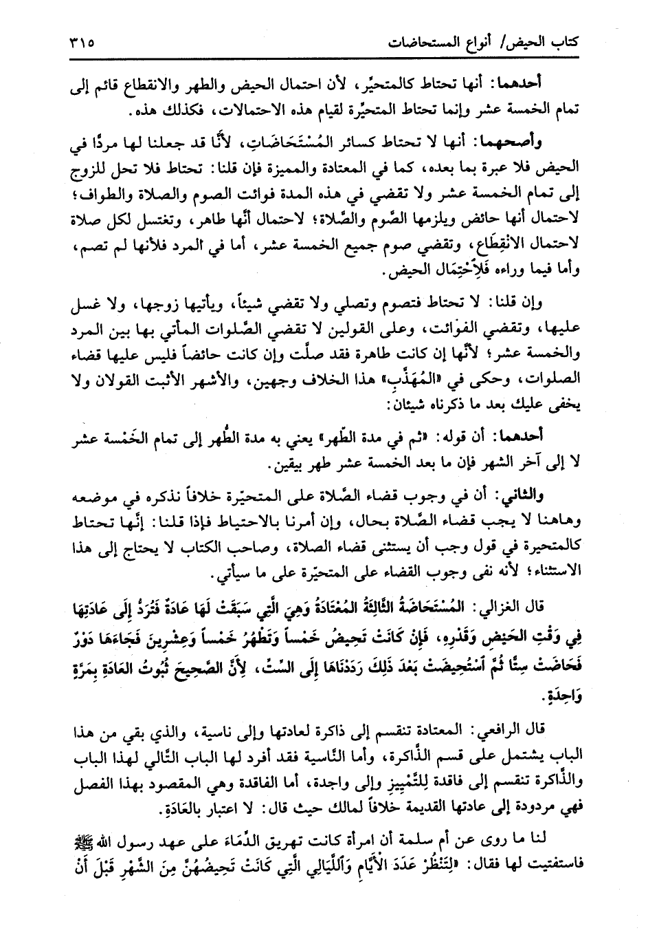 قال الغزالي: المُسْتَحَاضَةُ الثَّالِثَةُ المُعْتَادَةُ وَهِيَ الَّتِي سَبَقَتْ لَهَا عَادَةٌ فَتُرَدُّ إِلَى عَادَتِهَا فِي وَقْتِ الحَيْضِ وَقَدْرِهِ، فَإِنْ كَانَتْ تَحِيضُ خَمْساً وَتَطْهُرُ خَمْسًا وَعِشْرِينَ فَجَاءَهَا دَوْرٌ فَحَاضَتْ سِتًّا ثُمَّ اسْتُحِيضَتْ بَعْدَ ذَلِكَ رَدَدْنَاهَا إِلَى السِّتِّ، لِأَنَّ الصَّحِيحَ ثُبُوتُ العَادَةِ بِمَرَّةٍ وَاحِدَةٍ.