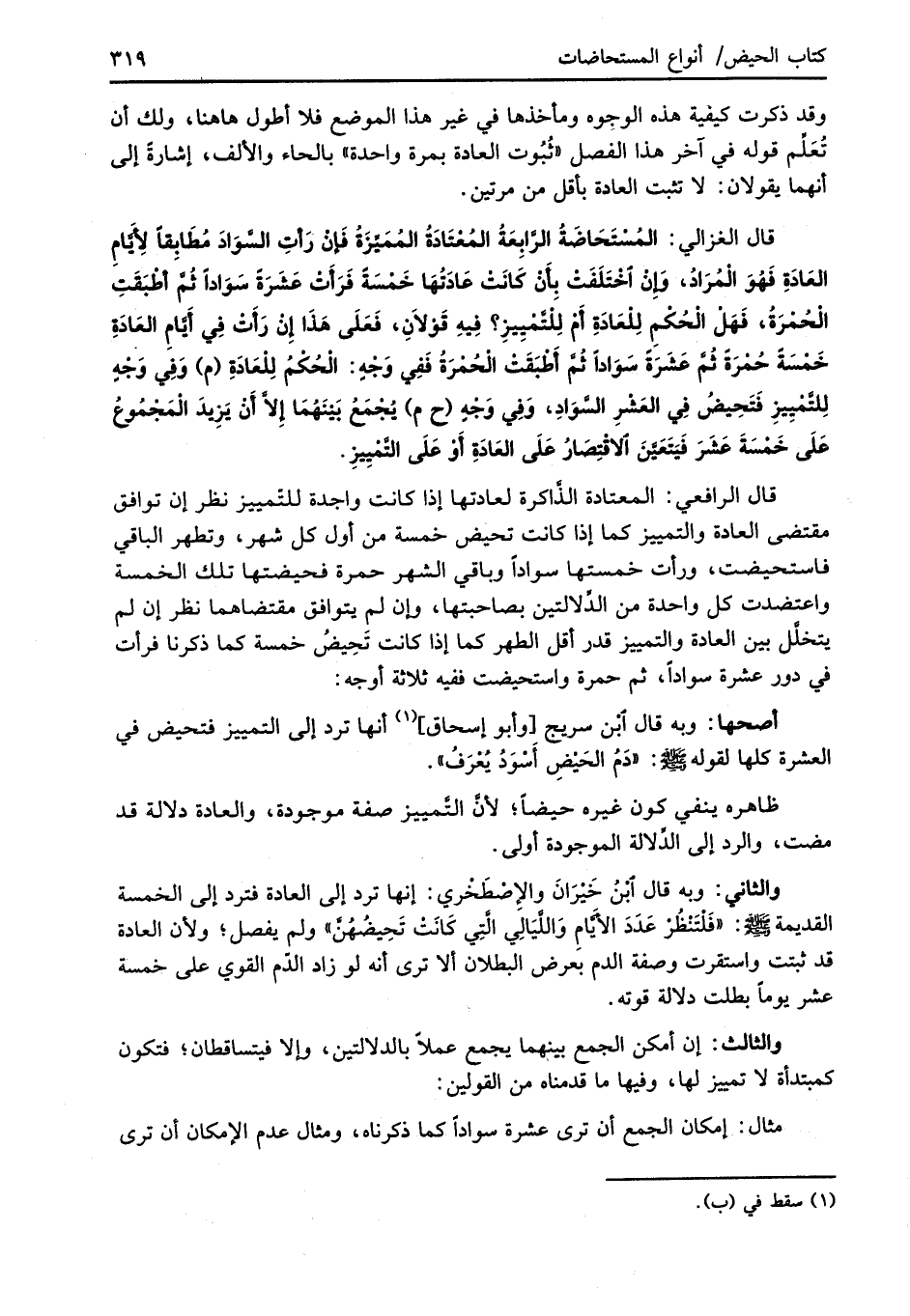 قال الغزالي: المُسْتَحَاضَةُ الرَّابِعَةُ المُعْتَادَةُ المُمَيِّزَةُ فَإِنْ رَأتِ السَّوَادَ مُطَابِقًا لأيَّامِ العَادَةِ فَهُوَ الْمُرَادُ، وإن اختَلَفَت بِأَنْ كَانَتْ عَادَتُهَا خَمْسَةً فَرَأَتْ عَشَرَةً سَوَاداً ثُمَّ أطْبَقَتِ الحُمْرَةُ، فَهَلْ الحُكْمِ لِلْعَادَةِ أَمْ لِلْتَّمْيِيزِ؟ فِيهِ قَوْلاَنِ، فَعَلَى هَذَا إنْ رَأَتْ فِي أَيَّامِ العَادَةِ خَمْسَةً حُمْرَةً ثُمَّ عَشَرَةً سوَاداً ثُمَّ أَطْبَقَتْ الحُمْرَةُ فَفِي وَجْهٍ: الحُكْمُ لِلْعَادَةِ (م) وَفِي وَجْهٍ لِلتَّميِيزِ فَتَحِيضُ فِي العَشْرِ السَّوَادِ، وَفِي وَجْهٍ (ح م) يُجْمَعُ بَيْنَهُمَا إلاَّ أَنْ يَزِيدَ المَجْمُوعُ عَلَى خَمْسَةَ عَشَرَ فَيَتَعَيَّنَ الاقْتِصَارُ عَلَى العَادَةِ أَوْ عَلَى التَّمْيِيزِ.
