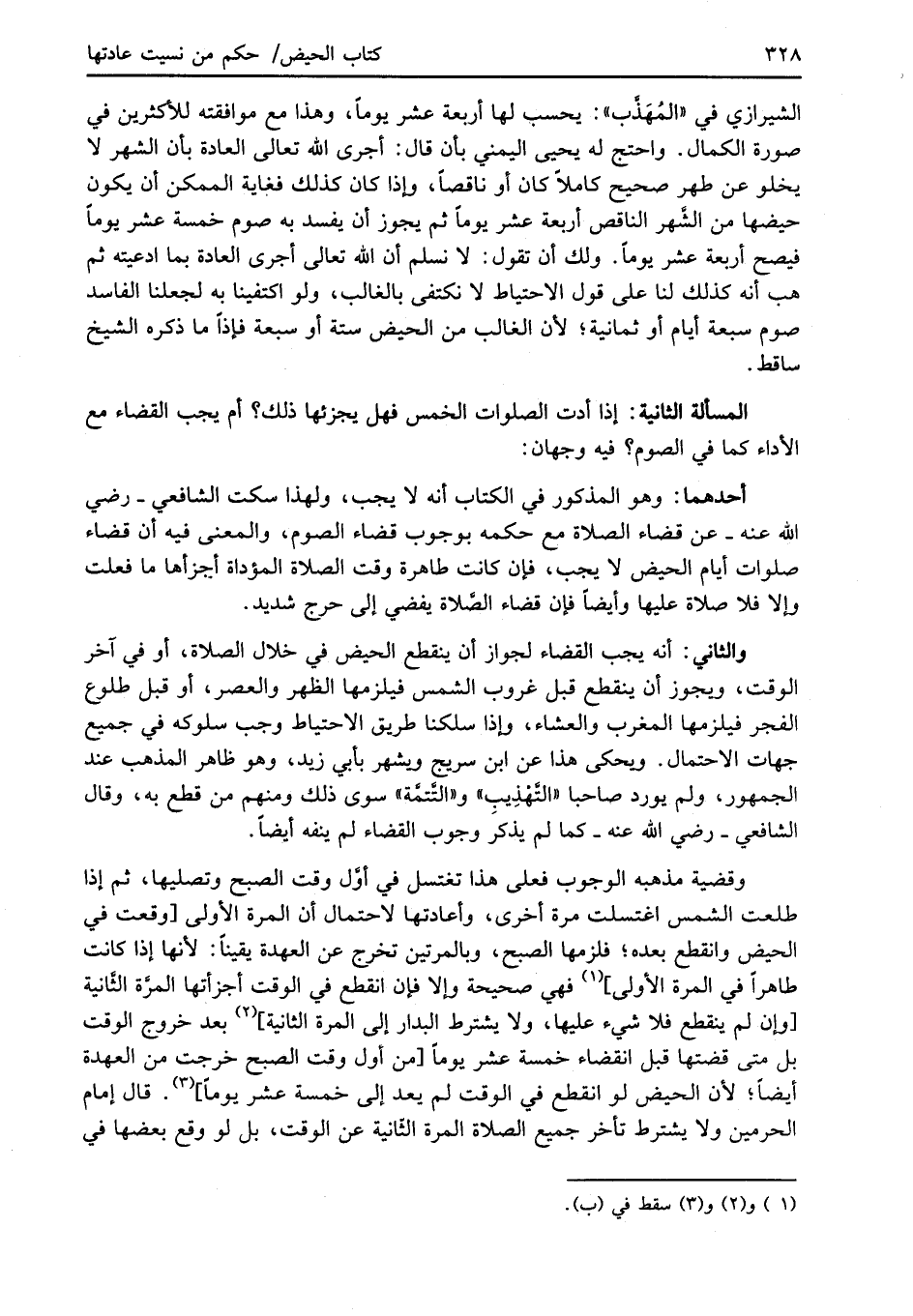 الشيرازي في "المُهَذَّب": يحسب لها أربعة عشر يوماً، وهذا مع موافقته للأكثرين في صورة الكمال. واحتج له يحيى اليمني بأن قال: أجرى الله تعالى العادة بأن الشهر لا يخلو عن طهر صحيح كاملاً كان أو ناقصاً، وإذا كان كذلك فغاية الممكن أن يكون حيضها من الشَّهر الناقص أربعة عشر يوماً ثم يجوز أن يفسد به صوم خمسة عشر يوماً فيصح أربعة عشر يوماً. ولك أن تقول: لا نسلم أن الله تعالى أجرى العادة بما ادعيته ثم هب أنه كذلك لنا على قول الاحتياط لا نكتفى بالغالب، ولو اكتفينا به لجعلنا الفاسد صوم سبعة أيام أو ثمانية؛ لأن الغالب من الحيض ستة أو سبعة فإذاً ما ذكره الشيخ ساقط.