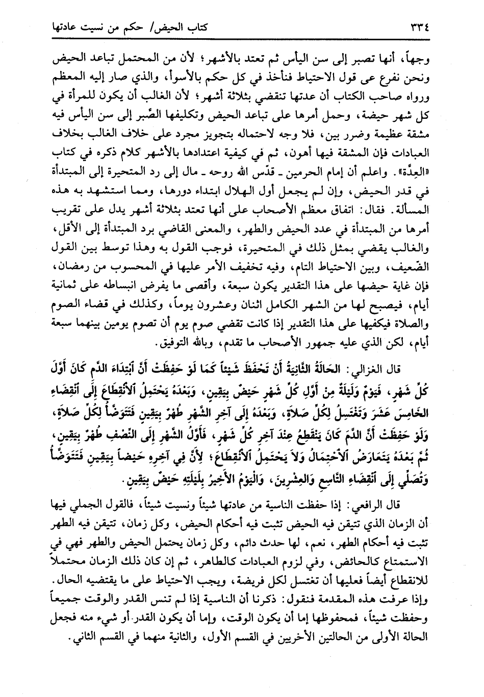 قال الرافعي: إذا حفظت الناسية من عادتها شيئاً ونسيت شيئاً، فالقول الجملي فيها أن الزمان الذي تتيقن فيه الحيض تثبت فيه أحكام الحيض، وكل زمان، تتيقن فيه الطهر تثبت فيه أحكام الطهر، نعم، لها حدث دائم، وكل زمان يحتمل الحيض والطهر فهي في الاستمتاع كالحائض، وفي لزوم العبادات كالطاهر، ثم إن كان ذلك الزمان محتملاً للانقطاع أيضاً فعليها أن تغتسل لكل فريضة، ويجب الاحتياط على ما يقتضيه الحال. وإذا عرفت هذه المقدمة فنقول: ذكرنا أن الناسية إذا لم تنس القدر والوقت جميعاً وحفظت شيئاً، فمحفوظها إما أن يكون الوقت، وإما أن يكون القدر. أو شيء منه فجعل الحالة الأولى من الحالتين الأخريين في القسم الأول، والثانية منهما في القسم الثاني.