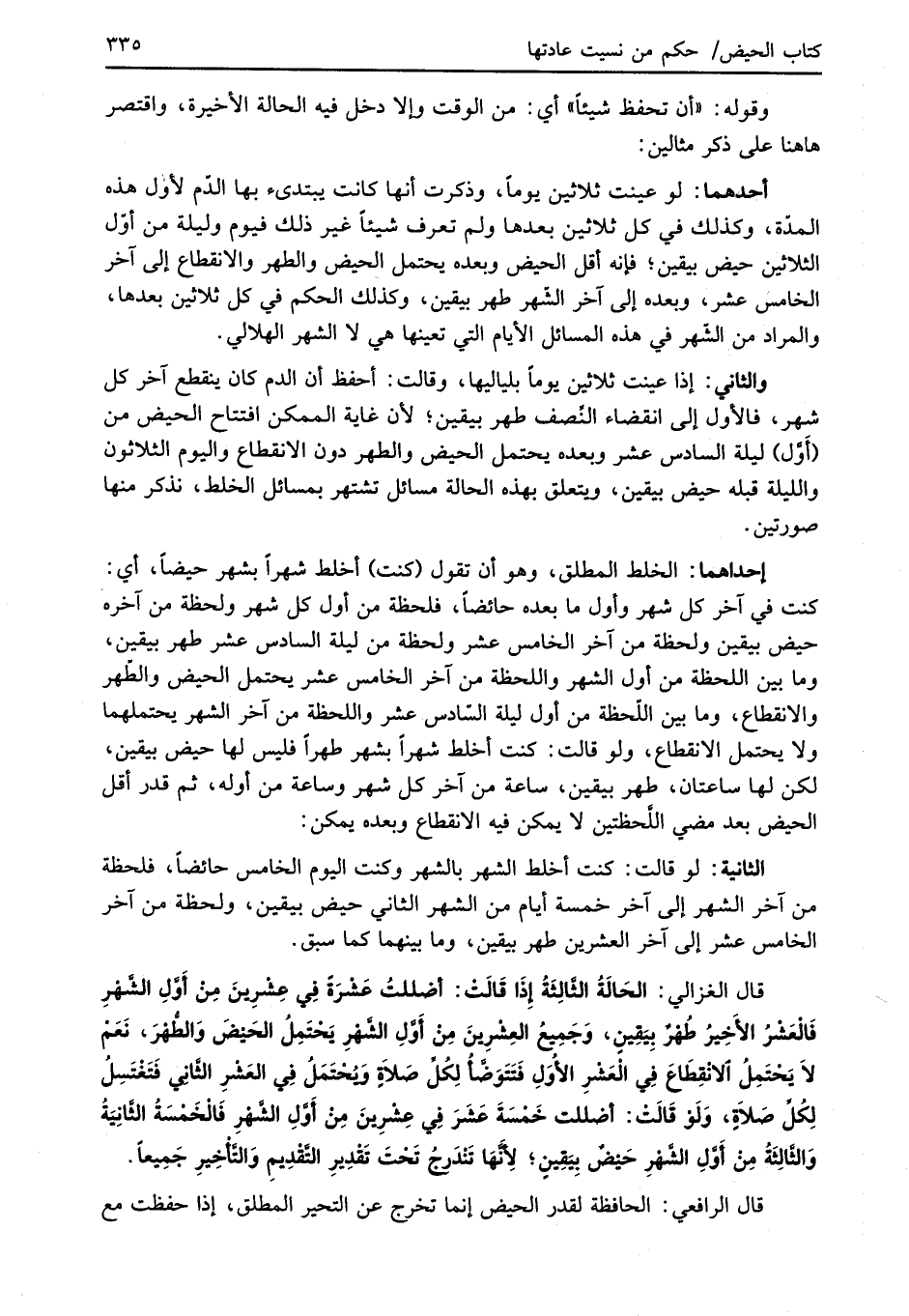 قال الغزالي: الحَالَةُ الثَّالِثَةُ إِذَا قَالَتْ: أضللتُ عَشْرَةً فِي عِشْرِينَ مِنْ أَوَّلِ الشَّهْرِ فَالْعَشْرُ الأَخِيرُ طُهْرٌ بِيَقِينٍ، وَجَمِيعُ العِشْرِينَ مِنْ أَوَّلِ الشَّهْرِ يَحْتَمِلُ الحَيْضَ وَالطُّهرَ، نَعَمْ لاَ يَحْتَمِلُ الانقِطَاعَ فِي الْعَشْرِ الأُوَلِ فَتَتَوَضَّأ لِكُلِّ صَلاَةٍ وَيُحْتَمَلُ فِي العَشْرِ الثَّانِي فَتَغْتَسِلُ لِكُلِّ صَلاَةٍ، وَلَوْ قَالَتْ: أضللت خَمْسَةَ عَشَرَ فِي عِشْرِينَ مِنْ أَوَّلِ الشَّهْرِ فَالْخَمْسَةُ الثَّانِيَةُ وَالثَّالِثَة مِنْ أَوَّلِ الشَّهْرِ حَيْضٌ بيَقِين؛ لِأَنَّهَا تَنْدَرجُ تَحْتَ تَقْدِيرِ التَّقْدِيمِ وَالتَّأخِيرِ جَمِيعاً.