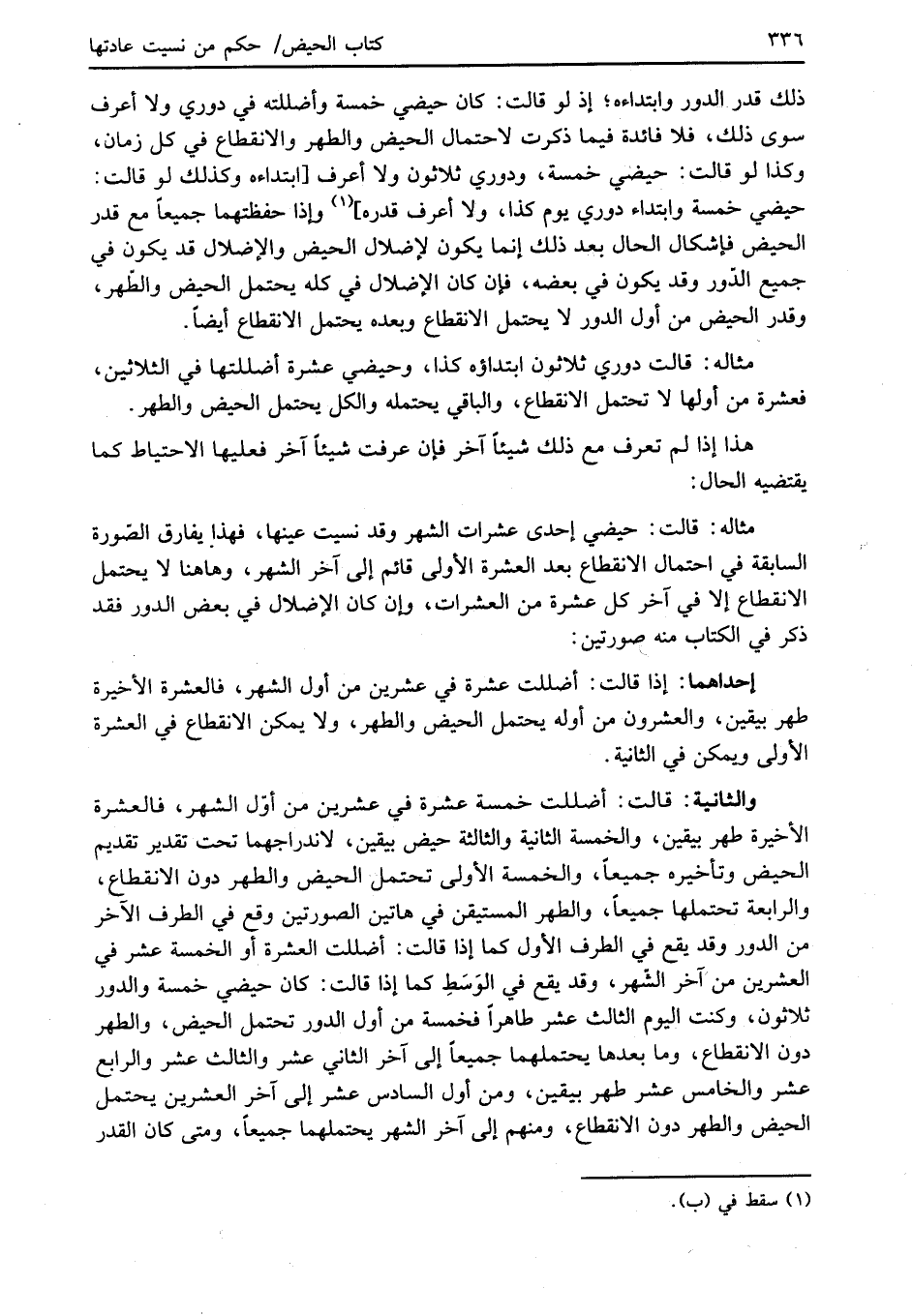 والثانية: قالت: أضللت خمسة عشرة في عشرين من أوّل الشهر، فالعشرة الأخيرة طهر بيقين، والخمسة الثانية والثالثة حيض بيقين، لاندراجهما تحت تقدير تقديم الحيض وتأخيره جميعاً، والخمسة الأولى تحتمل الحيض والطهر دون الانقطاع، والرابعة تحتملها جميعاً، والطهر المستيقن في هاتين الصورتين وقع في الطرف الآخر من الدور وقد يقع في الطرف الأول كما إذا قالت: أضللت العشرة أو الخمسة عشر في العشرين من آخر الشّهر، وقد يقع في الوَسَطِ كما إذا قالت: كان حيضي خمسة والدور ثلاثون، وكنت اليوم الثالث عشر طاهراً فخمسة من أول الدور تحتمل الحيض، والطهر دون الانقطاع، وما بعدها يحتملهما جميعاً إلى آخر الثاني عشر والثالث عشر والرابع عشر والخامس عشر طهر بيقين، ومن أول السادس عشر إلى آخر العشرين يحتمل الحيض والطهر دون الانقطاع، ومنهم إلى آخر الشهر يحتملهما جميعاً، ومتى كان القدر