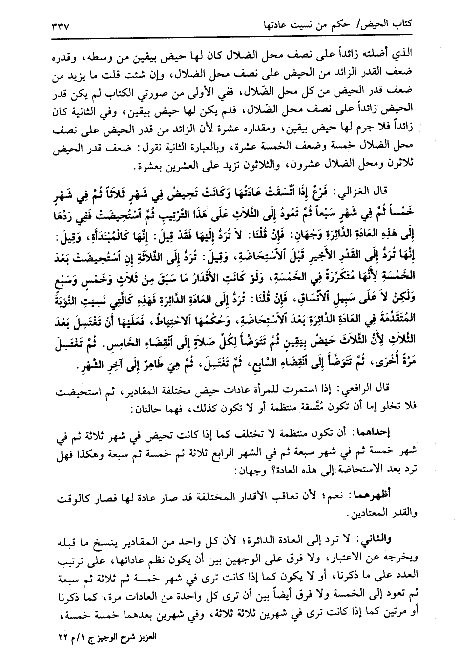 قال الغزالي: فَرْعٌ إِذَا اتَّسَقَتْ عَادَتُهَا وَكانَتْ تَحِيضُ فِي شَهْرٍ ثَلاَثاً ثُمَّ فِي شَهْرٍ خَمسًا ثُمَّ فِي شَهْرٍ سَبْعاً ثُمَّ تَعُودُ إِلَى الثَّلاَثِ عَلَى هَذَا التَّرْتِيبِ ثُمَّ اسْتُحِيضَتْ فَفِي رَدِّهَا إِلَى هَدِهِ العَادَةِ الدَّائِرَةِ وَجْهَانِ: فَإِنْ قُلْنَا: لاَ تُرَدُّ إِلَيْهَا فَقَدْ قِيلَ: إِنَّهَا كَالْمُبْتَدَأَةِ، وَقِيلَ: إِنَّهَا تُرَدُّ إِلَى القَدْرِ الأَخِيرِ قَبْلَ الاَسْتِحَاضَةِ، وَقِيلَ: تُرَدُّ إِلَى الثَّلاثَةِ إِنِ اسْتُحِيضَتْ بَعْدَ الخَمْسَةِ لِأَنَّهَا متَكَرِّرَة فِي الخَمْسَةِ، وَلَو كَانَتِ الأَقْدَار مَا سَبَقَ مِنْ ثَلاَثٍ وَخَمْسٍ وَسَبْعٍ وَلَكِنْ لاَ عَلَى سَبِيلِ الاتِّسَاقِ، فَإِنْ قُلْنَا: تُرَدُّ إِلَى العَادَةِ الدَّائِرَةِ فَهَذِهِ كَالَّتِي نَسِيَتِ النَّوْبَةَ المُتَقَدِّمَةَ فِي العَادَةِ الدَّائِرَةِ بَعْدَ الاسْتِحَاضَةِ، وَحُكْمُهَا الاحْتِيَاطُ، فَعَلَيْهَا أَنْ تَغْتَسِلَ بَعْدَ الثَّلاَثِ لِأنَّ الثَّلاَثَ حَيْضٌ بِيَقِينٍ ثُمَّ تَتَوَضَّأ لِكُلِّ صَلاَةٍ إِلَى انْقِضَاءِ الخَامِسِ. ثُمَّ تَغْتَسِلَ مَرَّةً أُخْرَى، ثُمَّ تَتَوَضَّأَ إِلَى انْقِضَاءِ السَّابعِ، ثُمَّ تَغْتَسِلَ، ثُمَّ هِيَ طَاهِرٌ إِلَى آخِرِ الشَّهْرِ.