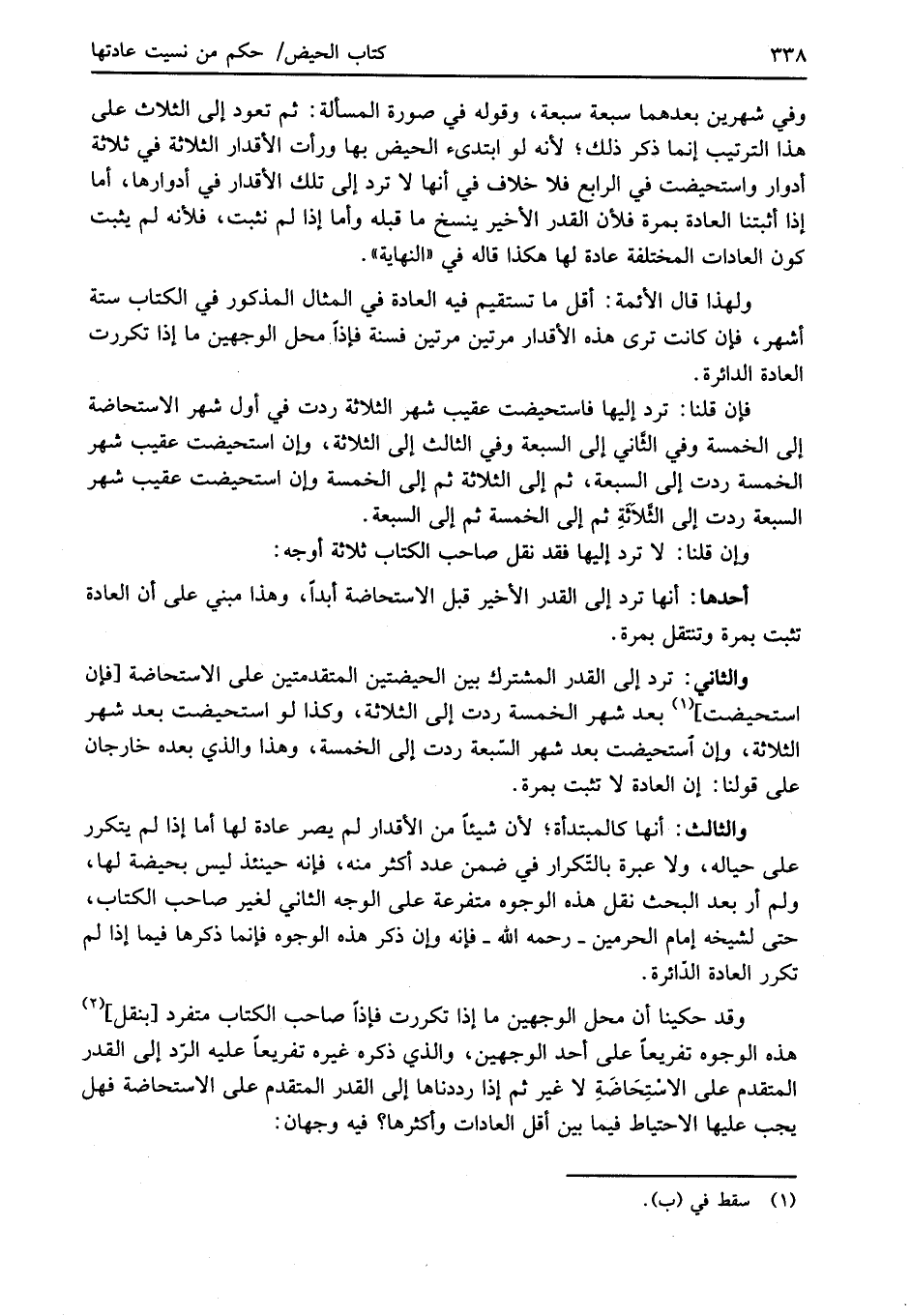 والثالث: أنها كالمبتدأة؛ لأن شيئاً من الأقدار لم يصر عادة لها أما إذا لم يتكرر على حياله، ولا عبرة بالتّكرار في ضمن عدد أكثر منه، فإنه حينئذ ليس بحيضة لها، ولم أر بعد البحث نقل هذه الوجوه متفرعة على الوجه الثاني لغير صاحب الكتاب، حتى لشيخه إمام الحرمين -رحمه الله- فإنه وإن ذكر هذه الوجوه فإنما ذكرها فيما إذا لم تكرر العادة الدّائرة.