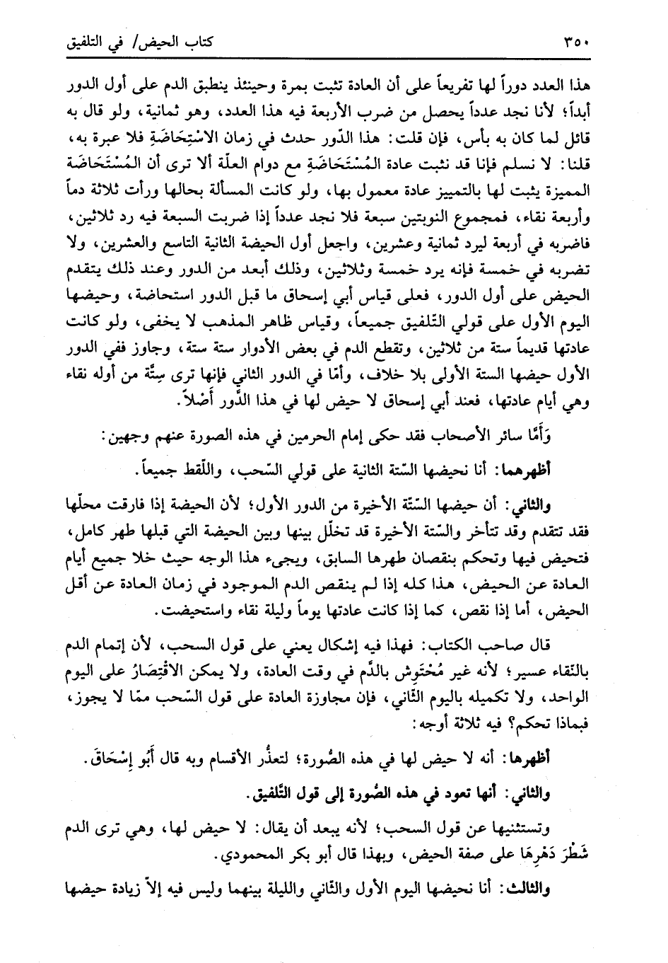 قال صاحب الكتاب: فهذا فيه إشكال يعني على قول السحب، لأن إتمام الدم بالنّقاء عسير؛ لأنه غير مُحْتَوِش بالدَّم في وقت العادة، ولا يمكن الاقْتِصَارُ على اليوم الواحد، ولا تكميله باليوم الثّاني، فإن مجاوزة العادة على قول السّحب ممّا لا يجوز، فبماذا تحكم؟ فيه ثلاثة أوجه: