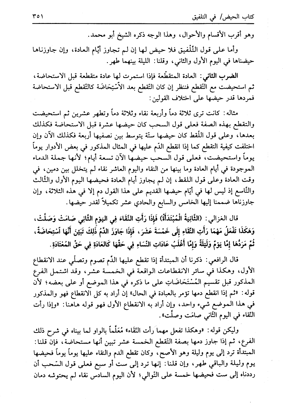 قال الغزالي: (الثَّانِيَةُ الْمُبْتَدَأَةُ) فَإذَا رَأَتِ النَّقَاءَ فِي اليَوْمِ الثَّانِي صَامَتْ وَصَلَّتْ، وَهَكَذَا تَفْعَلُ مَهْمَا رَأَتِ النَّقَاءِ إِلَى خَمْسَةَ عَشَرَ، فَإِذَا جَاوَزَ الدَّمُ ذَلِكَ تَبَيَّنَ أَنَّهَا اسْتِحَاضَةٌ، ثُمَّ مَرَدُّهَا إِمَّا يَوْمٌ وَلَيلَةٌ وَإِمَّا أَغْلَبُ عَادَاتِ النِّسَاءِ فِي حَقِّهَا كَالعَادَةِ فِي حَقِّ المُعْتَادَةِ.