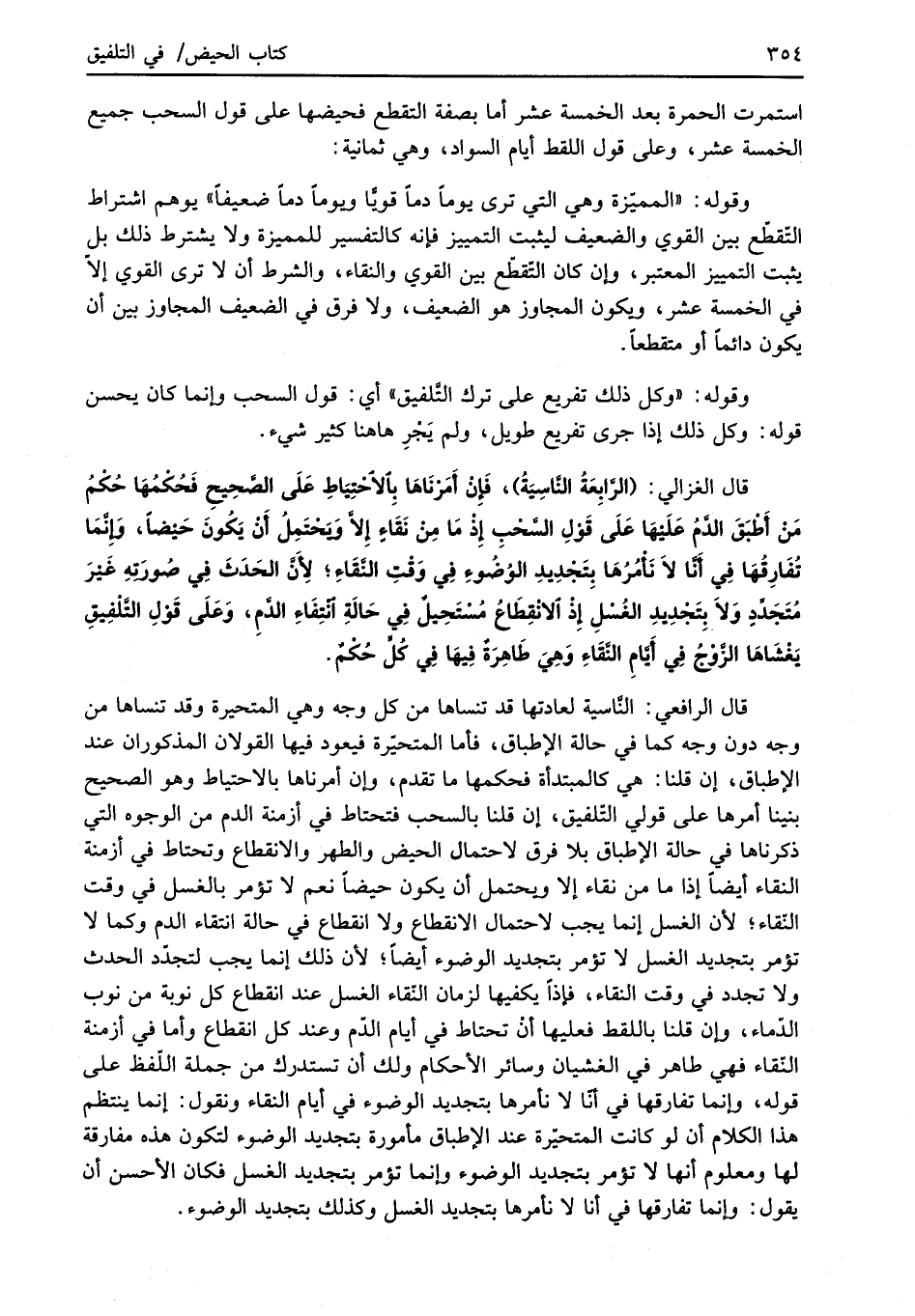 قال الرافعي: النَّاسية لعادتها قد تنساها من كل وجه وهي المتحيرة وقد تنساها من وجه دون وجه كما في حالة الإطباق، فأما المتحيّرة فيعود فيها القولان المذكوران عند الإطباق، إن قلنا: هي كالمبتدأة فحكمها ما تقدم، وإن أمرناها بالاحتياط وهو الصحيح بنينا أمرها على قولي التّلفيق، إن قلنا بالسحب فتحتاط في أزمنة الدم من الوجوه التي ذكرناها في حالة الإطباق بلا فرق لاحتمال الحيض والطهر والانقطاع وتحتاط في أزمنة النقاء أيضاً إذا ما من نقاء إلا ويحتمل أن يكون حيضًا نعم لا تؤمر بالغسل في وقت النّقاء؛ لأن الغسل إنما يجب لاحتمال الانقطاع ولا انقطاع في حالة انتقاء الدم وكما لا تؤمر بتجديد الغسل لا تؤمر بتجديد الوضوء إيضًا؛ لأن ذلك إنما يجب لتجدّد الحدث ولا تجدد في وقت النقاء، فإذًا يكفيها لزمان النّقاء الغسل عند إنقطاع كل نوبة من نوب الدّماء، وإن قلنا باللقط فعليها أنْ تحتاط في أيام الدّم وعند كل انقطاع وأما في أزمنة النّقاء فهي طاهر في الغشيان وسائر الأحكام ولك أن تستدرك من جملة اللّفظ على قوله، وإنما تفارقها في أنّا لا نأمرها بتجديد الوضوء في أيام النقاء ونقول: إنما ينتظم هذا الكلام أن لو كانت المتحيّرة عند الإطباق مأمورة بتجديد الوضوء لتكون هذه مفارقة لها ومعلوم أنها لا تؤمر بتجديد الوضوء وإنما تؤمر بتجديد الغسل فكان الأحسن أن يقول: وإنما تفارقها في أنا لا نأمرها بتجديد الغسل وكذلك بتجديد الوضوء.