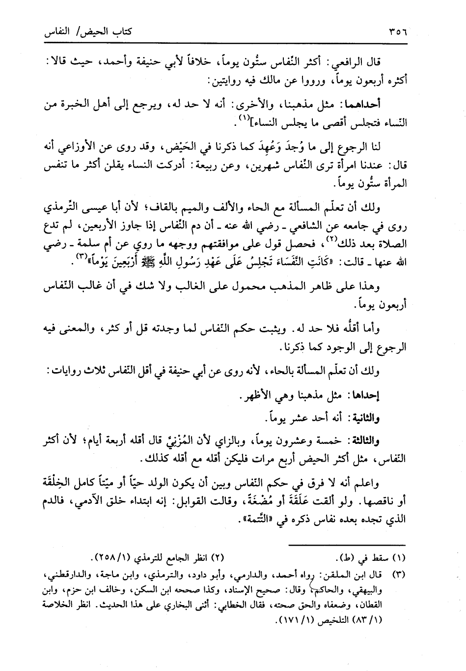 قال الرافعي: أكثر النِّفاس ستُّون يوماً، خلافاً لأبي حنيفة وأحمد، حيث قالا: أكثره أربعون يوماً، ورووا عن مالك فيه روايتين: