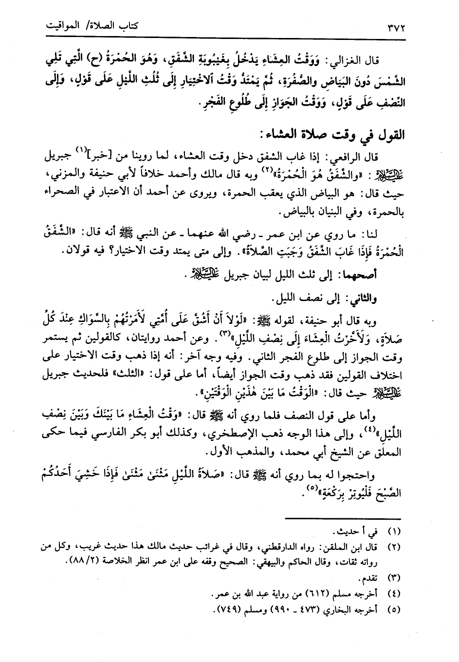 قال الرافعي: إذا غاب الشفق دخل وقت العشاء، لما روينا من [خبر] (¬1) جبريل عليه السلام: "والشَّفَقُ هُوَ الْحُمْرَةُ" (¬2) وبه قال مالك وأحمد خلافاً لأبي حنيفة والمزني، حيث قال: هو البياض الذي يعقب الحمرة، ويروى عن أحمد أن الاعتبار في الصحراء بالحمرة، وفي البنيان بالبياض.