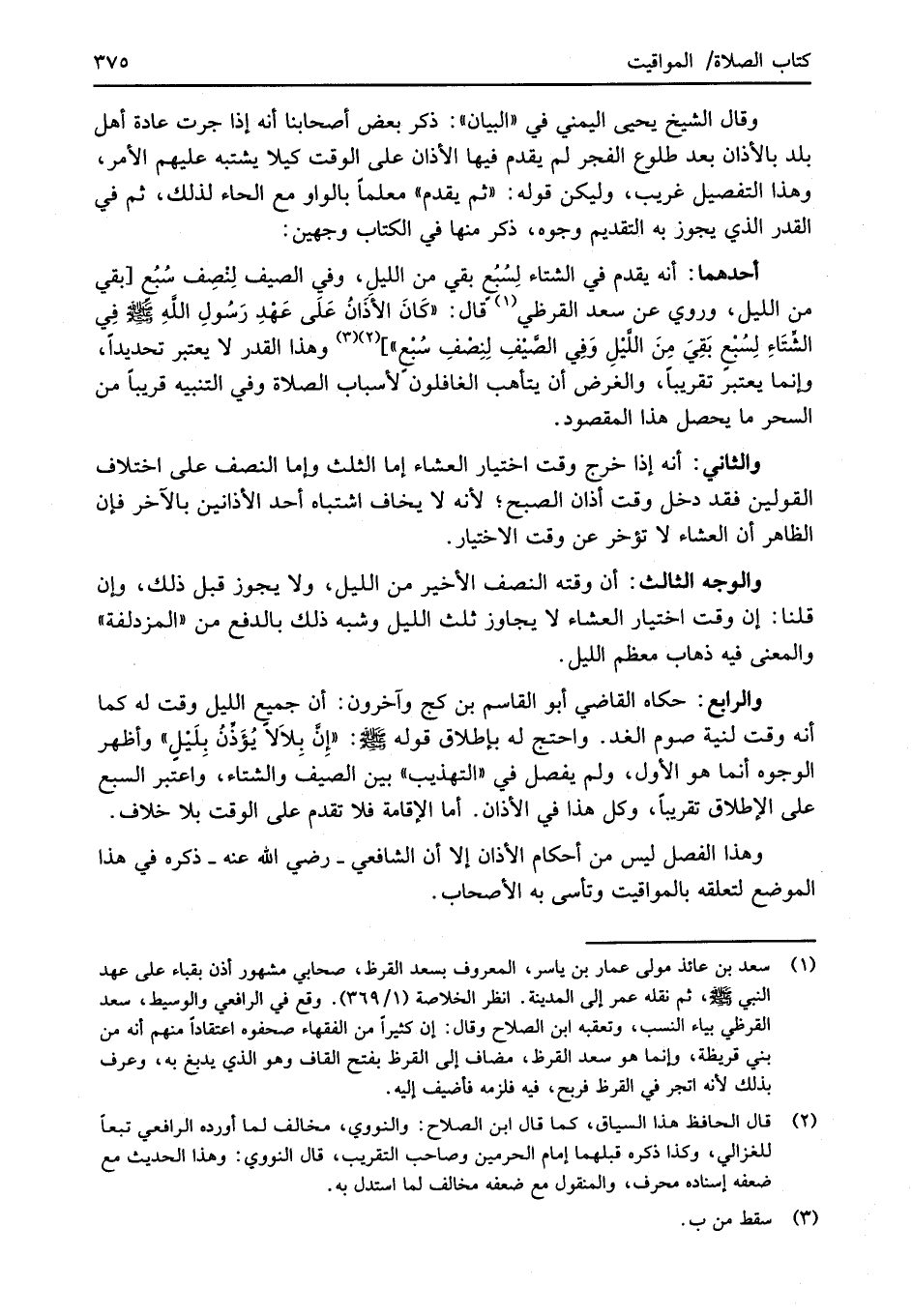 (¬1) سعد بن عائذ مولى عمار بن ياسر، المعروف بسعد القرظ، صحابي مشهور أذن بقباء على عهد النبي -صلى الله عليه وسلم-، ثم نقله عمر إلى المدينة. انظر الخلاصة (1/ 369). وقع في الرافعي والوسيط، سعد القرظي بياء النسب، وتعقبه ابن الصلاح وقال: إن كثيراً من الفقهاء صحفوه اعتقاداً منهم أنه من بني قريظة، وإنما هو سعد القرظ، مضاف إلى القرظ بفتح القاف وهو الذي يدبغ به، وعرف بذلك لأنه اتجر في القرظ فربح، فيه فلزمه فأضيف إليه.
