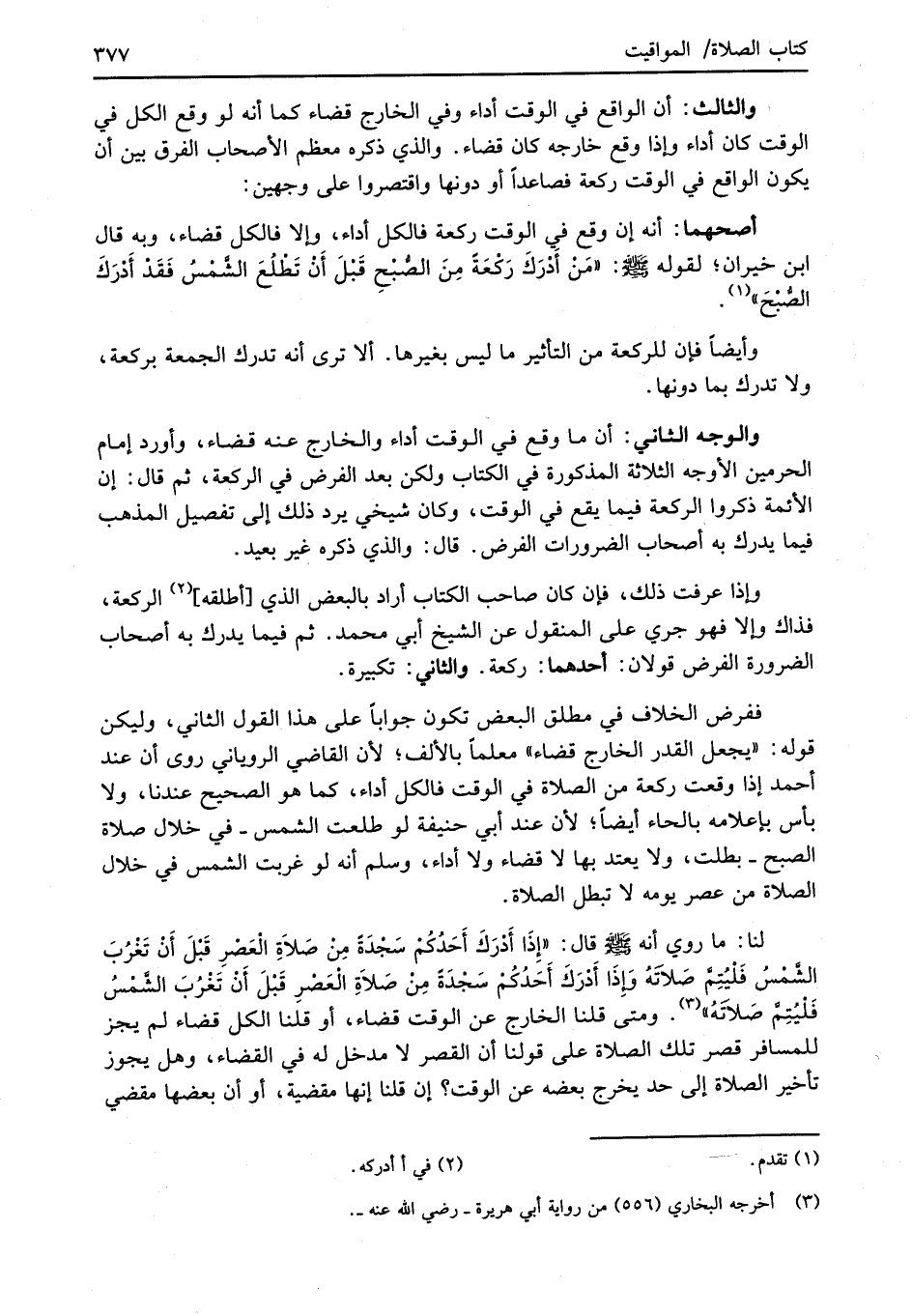 لنا: ما روي أنه -صلى الله عليه وسلم- قال: "إِذَا أَدْرَكَ أَحَدُكُمْ سَجْدَةً مِنْ صَلاَةِ الْعَصْرِ قَبْلَ أَنْ تَغْرُبَ الشَّمْسُ فَلْيُتِمَّ صَلاتَهُ وَإذَا أَدْرَكَ أَحَدُكُمْ سَجْدَةً مِنْ صَلاَةِ الْعَصْرِ قَبْلَ أنْ تَغْرُبَ الشَّمْسُ فَلْيُتِمَّ صَلاتَهُ" (¬3). ومتى قلنا الخارج عن الوقت قضاء، أو قلنا الكل قضاء لم يجز للمسافر قصر تلك الصلاة على قولنا أن القصر لا مدخل له في القضاء، وهل يجوز تأخير الصلاة إلى حد يخرج بعضه عن الوقت؟ إن قلنا إنها مقضية، أو أن بعضها مقضي