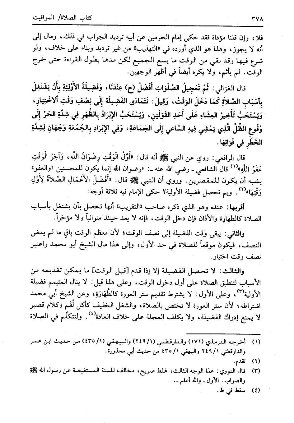 قال الغزالي: ثُمَّ تَعْجِيلُ الصَّلَوَاتِ أَفْضَلُ (ح) عِنْدَنَا، وَفَضِيلَةُ الأَوَّليَّةِ بِأنْ يَشْتَغِلَ بِأسْبَابِ الصَّلاَة كَمَا دَخَلَ الوَقْتُ، وَقِيلَ: تَتَمَادَى الفَضِيلَة اِلَى نِصْفِ وَقْتِ الاخْتِيَارِ، وَيُسْتَحَبُّ تَأْخِيرُ العِشَاءِ عَلَى أَحَدِ القَوْلَيْنِ، ويُسْتَحَبُّ الإبْرَادُ بِالظُّهْرِ فِي شِدَّةِ الحَرِّ إِلَى وُقُوعِ الظِّلِّ الَّذِي يَمْشِي فِيهِ السَّاعي إِلَى الجَمَاعَةِ، وَفِي الإبْرَادِ بِالجُمُعَةِ وَجْهَانِ لِشِدَّةِ الخَطَرِ في فَوَاتِهَا.