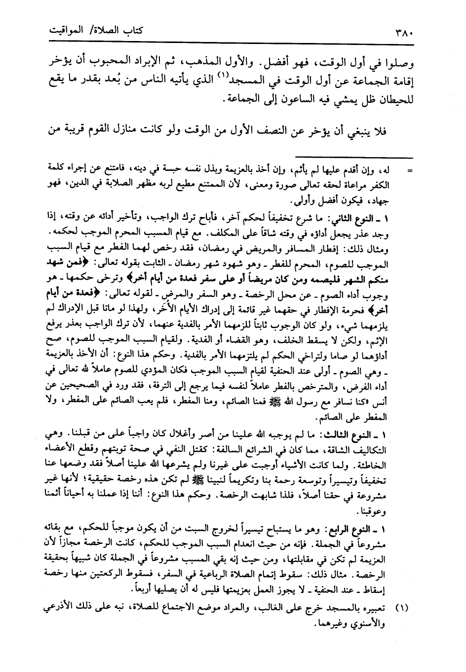 4 - النوع الرابع: وهو ما يستباح تيسيراً لخروج السبت من أن يكون موجباً للحكم، مع بقائه مشروعًا في الجملة. فإنه من حيث انعدام السبب الموجب للحكم، كانت الرخصة مجازاً لأن العزيمة لم تكن في مقابلتها، ومن حيث إنه بقي المسبب مشروعاً في الجملة كان شبيهاً بحقيقة الرخصة. مثال ذلك: سقوط إتمام الصلاة الرباعية في السفر، فسقوط الركعتين منها رخصة إسقاط -عند الحنفية- لا يجوز العمل بعزيمتها فليس له أن يصليها أربعاً.