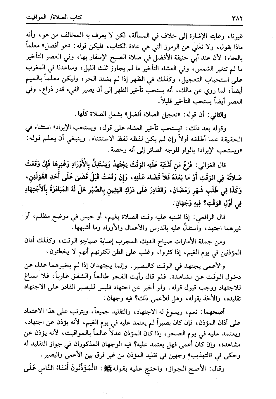 قال الغزالي: فَرْعٌ مَنِ اشْتَبَهَ عَلَيْهِ الوَقْتُ يَجْتَهِدُ وَيسْتَدِلُّ بِالأَوْرَادِ وَغَيْرِهَا فَإِنْ وَقَعَتْ صَلاتُهُ فِي الوَقْتِ أَوْ مَا بَعْدَهُ فَلاَ قَضَاءَ عَلَيْهِ، وَإِنْ وَقَعَتْ قَبْلُ قَضَى عَلَى أَحَدِ القَوْلَيْنِ، وَكذَا فِي طَلَبِ شَهْرِ رَمَضَانَ، وَالقَادِرُ عَلَى دَرْكِ اليَقِينِ بِالصَّبْرِ هَلْ لَهُ المُبَادرَةُ بِالاجْتِهَادِ فِي أَوَّلِ الوَقْتِ؟ فِيهِ وَجْهَانِ.