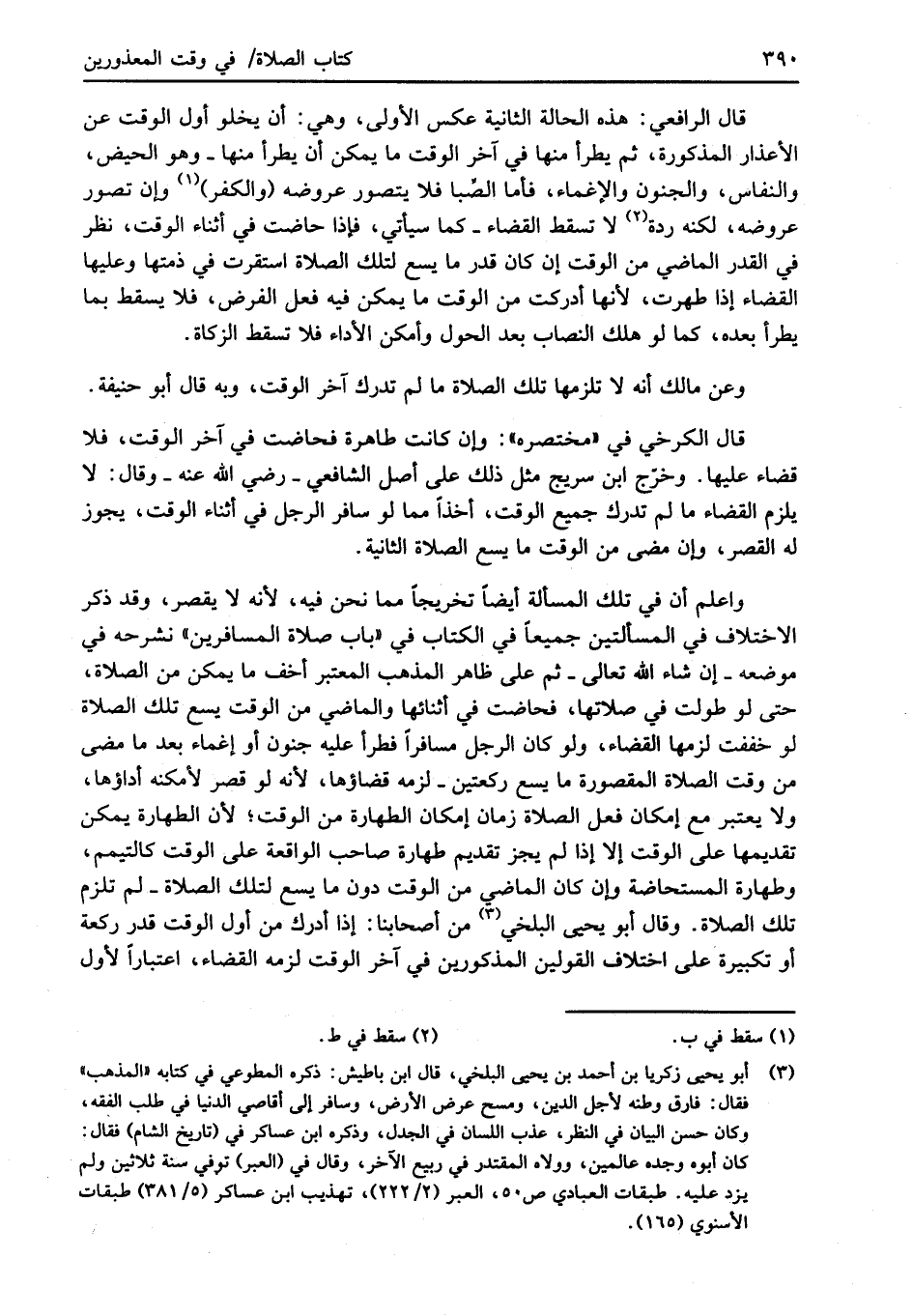 واعلم أن في تلك المسألة أيضاً تخريجاً مما نحن فيه، لأنه لا يقصر، وقد ذكر الاختلاف في المسألتين جميعاً في الكتاب في "باب صلاة المسافرين" نشرحه في موضعه -إن شاء الله تعالى- ثم على ظاهر المذهب المعتبر أخف ما يمكن من الصلاة، حتى لو طولت في صلاتها، فحاضت في أثنائها والماضي من الوقت يسمع تلك الصلاة لو خففت لزمها القضاء، ولو كان الرجل مسافراً فطرأ عليه جنون أو إغماء بعد ما مضى من وقت الصلاة المقصورة ما يسع ركعتين -لزمه قضاؤها، لأنه لو قصر لأمكنه أداؤها، ولا يعتبر مع إمكان فعل الصلاة زمان إمكان الطهارة من الوقت؛ لأن الطهارة يمكن تقديمها على الوقت إلا إذا لم يجز تقديم طهارة صاحب الواقعة على الوقت كالتيمم، وطهارة المستحاضة وإن كان الماضي من الوقت دون ما يسع لتلك الصلاة- لم تلزم تلك الصلاة. وقال أبو يحيى البلخي (¬3) من أصحابنا: إذا أدرك من أول الوقت قدر ركعة أو تكبيرة على اختلاف القولين المذكورين في آخر الوقت لزمه القضاء، اعتباراً لأول