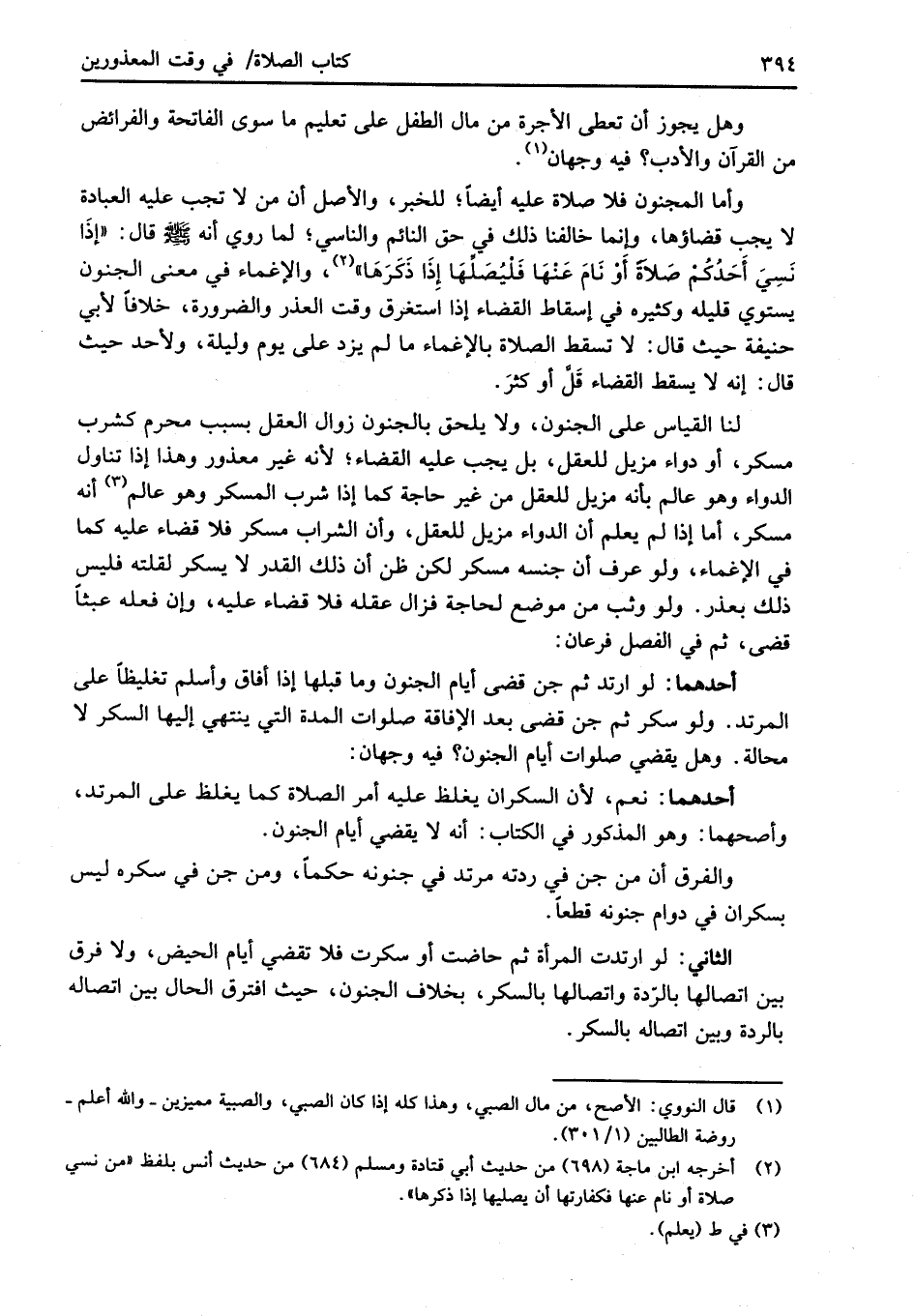 وأما المجنون فلا صلاة عليه أيضاً؛ للخبر، والأصل أن من لا تجب عليه العبادة لا يجب قضاؤها، وإنما خالفنا ذلك في حق النائم والناسي؛ لما روي أنه -صلى الله عليه وسلم- قال: "إذَا نَسِيَ أحَدُكُمْ صَلاَةً أَوْ نَامَ عَنْهَا فَليُصَلِّهَا إِذَا ذَكَرَهَا" (¬2)، والإغماء في معنى المجنون يستوي قليله وكثيره في إسقاط القضاء إذا استغرق وقت العذر والضرورة، خلافاً لأبي حنيفة حيث قال: لا تسقط الصلاة بالإغماء ما لم يزد على يوم وليلة، ولأحد حيث قال: إنه لا يسقط القضاء قَلَّ أو كثرَ.
