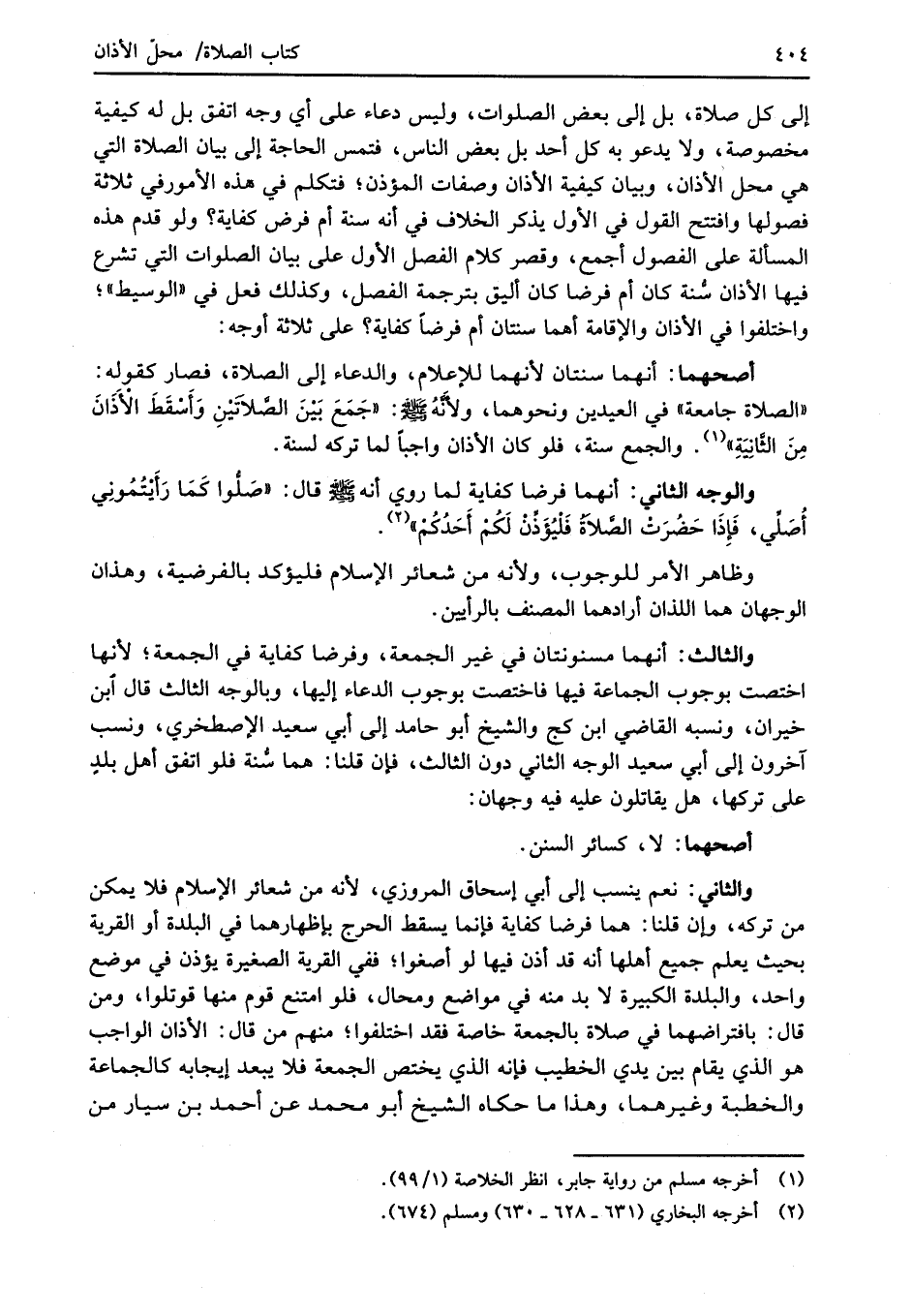 إلى كل صلاة، بل إلى بعض الصلوات، وليس دعاء على أي وجه اتفق بل له كيفية مخصوصة، ولا يدعو به كل أحد بل بعض الناس، فتمس الحاجة إلى بيان الصلاة التي هي محل الأذان، وبيان كيفية الأذان وصفات المؤذن؛ فتكلم في هذه الأمور في ثلاثة فصولها وافتتح القول في الأول يذكر الخلاف في أنه سنة أم فرض كفاية؟ ولو قدم هذه المسألة على الفصول أجمع، وقصر كلام الفصل الأول على بيان الصلوات التي تشرع فيها الأذان سُّنة كان أم فرضا كان أليق بترجمة الفصل، وكذلك فعل في "الوسيط"؛ واختلفوا في الأذان والإقامة أهما سنتان أم فرضاً كفاية؟ على ثلاثة أوجه: