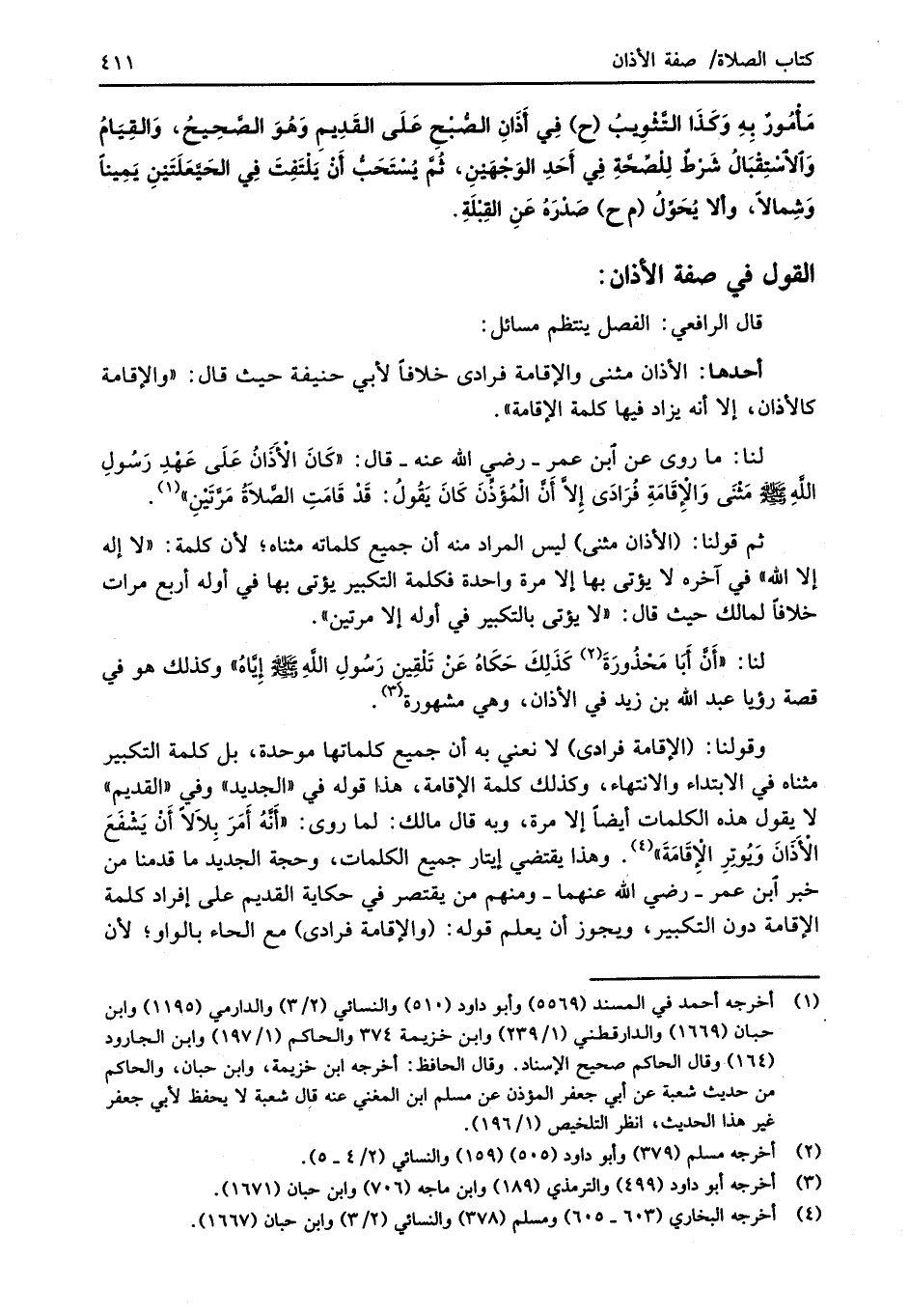 أحدها: الأذان مثنى والإقامة فرادى خلافاً لأبي حنيفة حيث قال: "والإقامة كالأذان، إلا أنه يزاد فيها كلمة الإقامة".