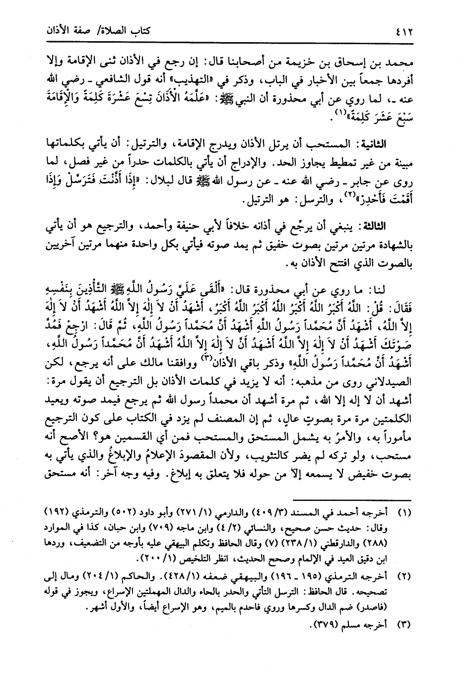 (¬2) أخرجه الترمذي (195 - 196) والبيهقي ضعفه (1/ 428). والحاكم (1/ 204) ومال إلى تصحيحه. قال الحافظ: الترسل التأتي والحدر بالحاء والدال المهملتين الاسراع، ويجوز في قوله (فاصدر) ضم الدال وكسرها وروي فاحدم بالميم، وهو الأسراع أيضاً، والأول أشهر.