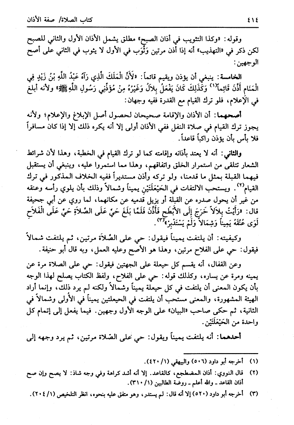 والثاني: أنه لا يعتد بأذانه وإقامته كما لو ترك القيام في الخطبة، وهذا لأن شرائط الشعار تتلقى من استمرار الخلق واتفاقهم، وهذا مما استمروا عليه، وينبغي أن يستقبل فيهما القبلة بمثل ما قدمنا، ولو تركه وأذن مستديراً ففيه الخلاف المذكور في ترك القيام (¬2). ويستحب الالتفات في الحَيْعَلَتَيْنِ يميناً وشمالاً وذلك بأن يلوي رأسه وعنقه من غير أن يحول صدره عن القبلة أو يزيل قدميه عن مكانهما، لما روي عن أبي جحيفة قال: "رَأَيْتُ بلاَلاً خَرَجَ إلَى الأَبْطَح فَأذَّنَ فَلَمَّا بَلَغَ حَيَّ عَلَى الصَّلاَةِ حَيَّ عَلَى الْفَلاَحِ لَوَى عُنُقَهُ يَمِينَاً وَشِمَالاً وَلَمْ يَسْتَدبِرْ" (¬3).