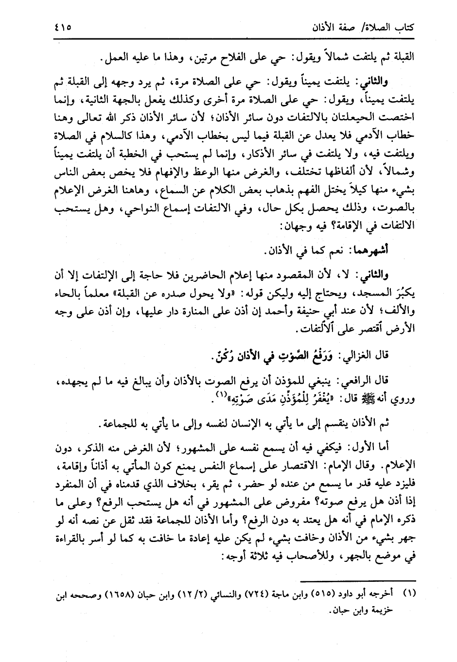 القبلة ثم يلتفت شمالاً ويقول: حي على الفلاح مرتين، وهذا ما عليه العمل.