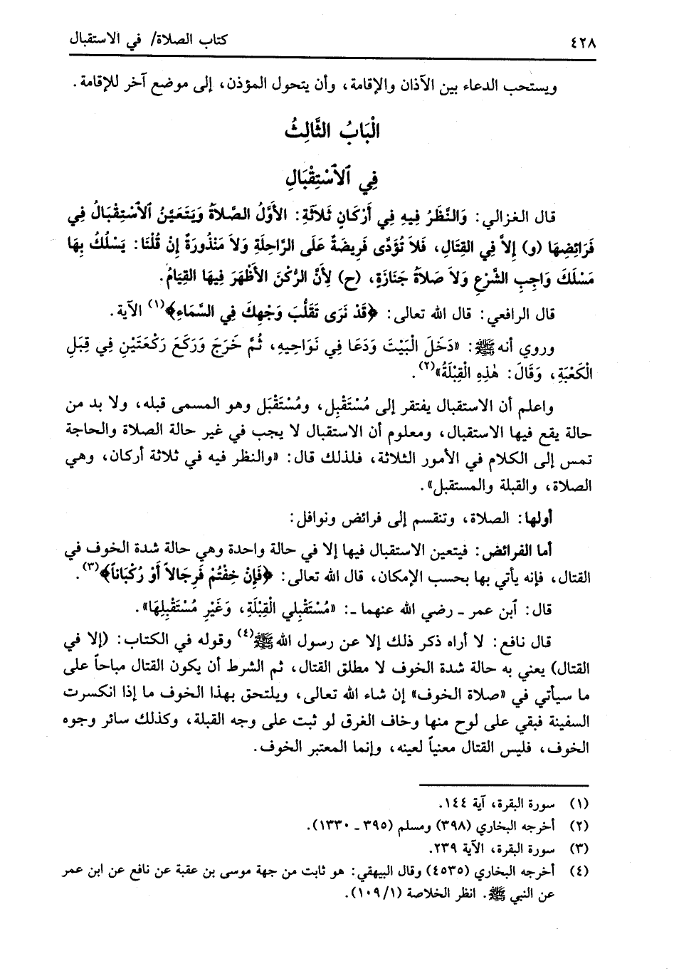 قال الغزالي: وَالنَّظَرُ فِيهِ فِي أَرْكَان ثَلاَثةِ: الأَوَّلُ الصَّلاَةُ وَيَتَعَيَّنُ الاسْتِقْبَالُ فِي فَرَائضِهَا (و) إلاَّ فِي القِتَالِ، فَلاَ تُؤَدَّى فَرِيضَةٌ عَلَى الرَّاحِلَةِ وَلاَ مَنْذُورَةٌ إنْ قُلْنَا: يَسْلُكُ بِهَا مَسْلَكَ وَاجِبِ الشَّرْعِ وَلاَ صَلاَةُ جَنَازَةٍ، (ح) لِأَنَّ الرُّكْنَ الأَظْهَرَ فِيهَا القِيَامُ.