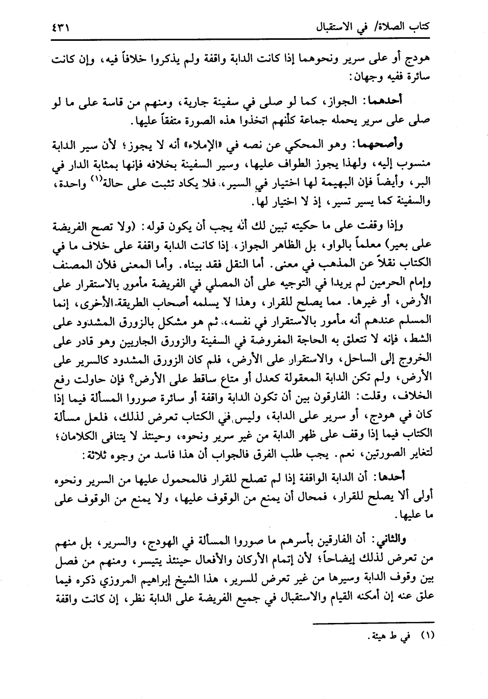 وإذا وقفت على ما حكيته تبين لك أنه يجب أن يكون قوله: (ولا تصح الفريضة على بعير) معلماً بالواو، بل الظاهر الجواز، إذا كانت الدابة واقفة على خلاف ما في الكتاب نقلاً عن المذهب في معنى. أما النقل فقد بيناه. وأما المعنى فلأن المصنف وإمام الحرمين لم يريدا في التوجيه على أن المصلي في الفريضة مأمور بالاستقرار على الأرض، أو غيرها. مما يصلح للقرار، وهذا لا يسلمه أصحاب الطريقة الأخرى، إنما المسلم عندهم أنه مأمور بالاستقرار في نفسه، ثم هو مشكل بالزورق المشدود على الشط، فإنه لا تتعلق به الحاجة المفروضة في السفينة والزورق الجاريين وهو قادر على الخروج إلى الساحل، والاستقرار على الأرض، فلم كان الزورق المشدود كالسرير على الأرض، ولم تكن الدابة المعقولة كعدل أو متاع ساقط على الأرض؟ فإن حاولت رفع الخلاف، وقلت: الفارقون بين أن تكون الدابة واقفة أو سائرة صوروا المسألة فيما إذا كان في هودج، أو سرير على الدابة، وليس في الكتاب تعرض لذلك، فلعل مسألة الكتاب فيما إذا وقف على ظهر الدابة من غير سرير ونحوه، وحينئذ لا يتنافى الكلامان؛ لتغاير الصورتين، نعم. يجب طلب الفرق فالجواب أن هذا فاسد من وجوه ثلاثة: