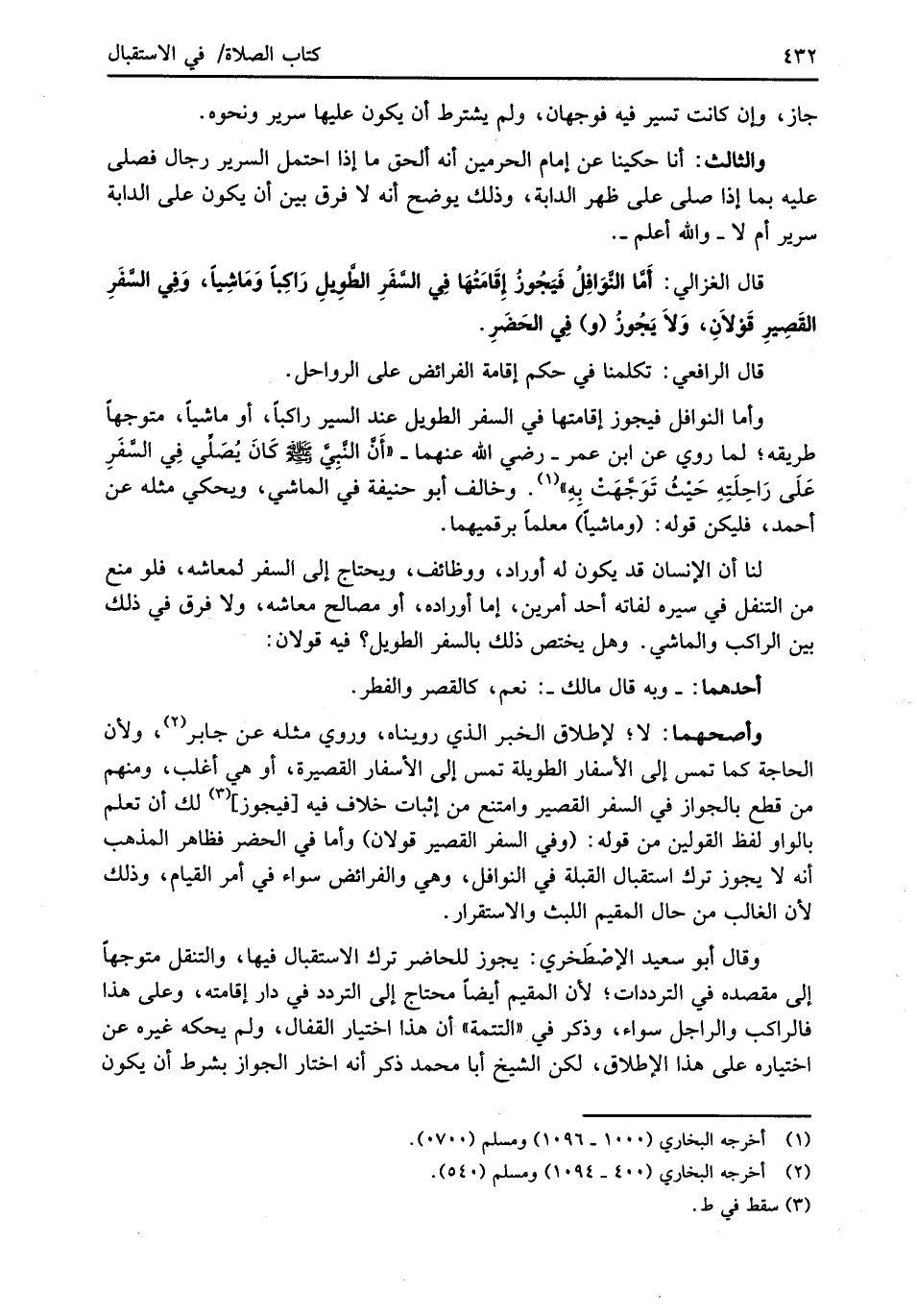 وأصحهما: لا؛ لإطلاق الخبر الذي رويناه، وروي مثله عن جابر (¬2)، ولأن الحاجة كما تمس إلى الأسفار الطويلة تمس إلى الأسفار القصيرة، أو هي أغلب، ومنهم من قطع بالجواز في السفر القصير وامتنع من إثبات خلاف فيه [فيجوز] (¬3) لك أن تعلم بالواو لفظ القولين من قوله: (وفي السفر القصير قولان) وأما في الحضر فظاهر المذهب أنه لا يجوز ترك استقبال القبلة في النوافل، وهي والفرائض سواء في أمر القيام، وذلك لأن الغالب من حال المقيم اللبث والاستقرار.
