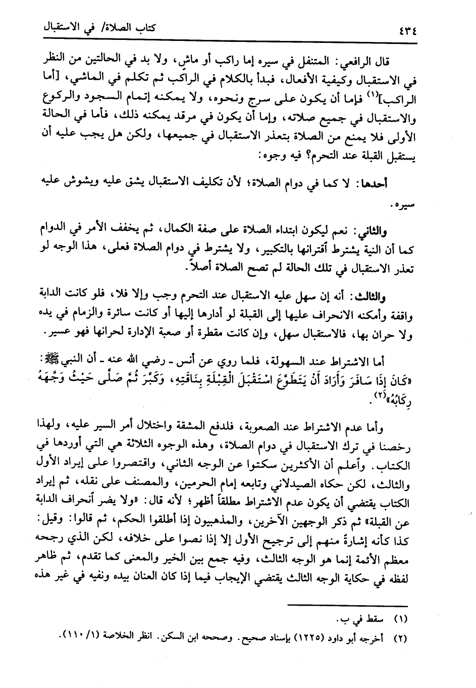 وأما عدم الاشتراط عند الصعوبة، فلدفع المشقة واختلال أمر السير عليه، ولهذا رخصنا في ترك الاستقبال في دوام الصلاة، وهذه الوجوه الثلاثة هي التي أوردها في الكتاب. واعلم أن الأكثرين سكتوا عن الوجه الثاني، واقتصروا على إيراد الأول والثالث، لكن حكاه الصيدلاني وتابعه إمام الحرمين، والمصنف على نقله، ثم إيراد الكتاب يقتضي أن يكون عدم الاشتراط مطلقاً أظهر؛ لأنه قال: "ولا يضر انحراف الدابة عن القبلة" ثم ذكر الوجهين الآخرين، والمذهبيون إذا أطلقوا الحكم، ثم قالوا: وقيل: كذا كأنه إشارةً منهم إلى ترجيح الأول إلا إذا نصوا على خلافه، لكن الذي رجحه معظم الأئمة إنما هو الوجه الثالث، وفيه جمع بين الخير والمعنى كما تقدم، ثم ظاهر لفظه في حكاية الوجه الثالث يقتضي الإيجاب فيما إذا كان العنان بيده ونفيه في غير هذه