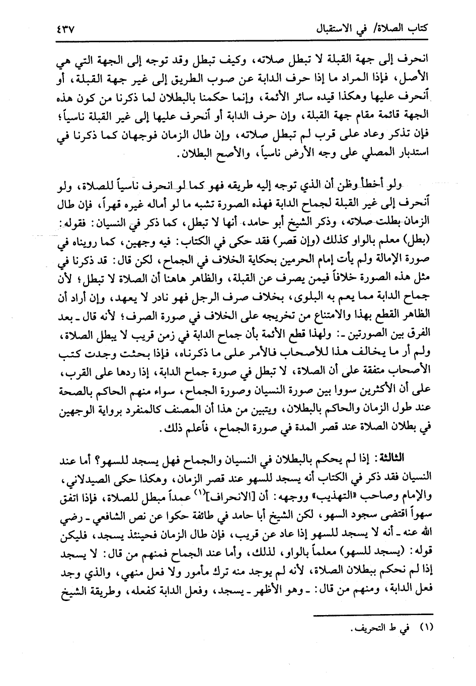 انحرف إلى جهة القبلة لا تبطل صلاته، وكيف تبطل وقد توجه إلى الجهة التي هي الأصل، فإذا المراد ما إذا حرف الدابة عن صوب الطريق إلى غير جهة القبلة، أو انحرف عليها وهكذا قيده سائر الأئمة، وإنما حكمنا بالبطلان لما ذكرنا من كون هذه الجهة قائمة مقام جهة القبلة، وإن حرف الدابة أو انحرف عليها إلى غير القبلة ناسيًا؛ فإن تذكر وعاد على قرب لم تبطل صلاته، وإن طال الزمان فوجهان كما ذكرنا في استدبار المصلي على وجه الأرض ناسيًا، والأصح البطلان.