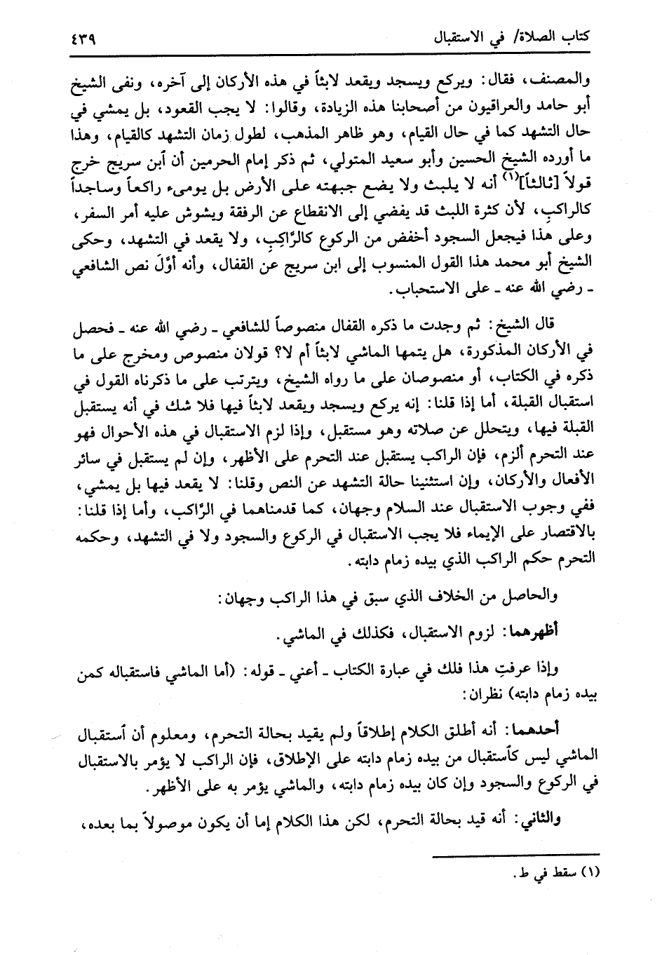 أحدهما: أنه أطلق الكلام إطلاقًا ولم يقيد بحالة التحرم، ومعلوم أن استقبال الماشي ليس كاستقبال من بيده زمام دابته على الإطلاق، فإن الراكب لا يؤمر بالاستقبال في الركوع والسجود وإن كان بيده زمام دابته، والماشي يؤمر به على الأظهر.