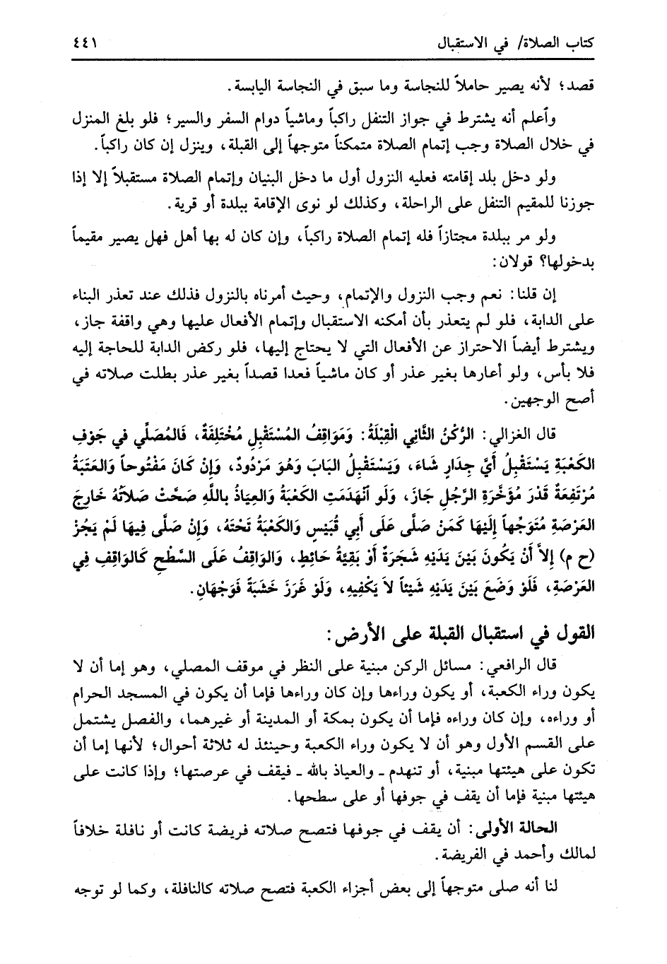 قال الغزالي: الرُّكْنُ الثَّانِي الْقِبْلَةُ: وَمَوَاقِفُ المُسْتَقْبِلِ مُخْتَلِفَةٌ، فَالمُصَلِّي في جَوْفِ الكَعْبَةِ يَسْتَقبِلُ أَيَّ جِدَارٍ شَاءَ، وَيَسْتَقْبِلُ البَابَ وَهُوَ مَردُودٌ، وَإِنْ كَانَ مَفْتُوحًا وَالعَتَبَةُ مُرْتَفِعَةٌ قَدْرَ مُؤَخَّرَةِ الرَّجُلِ جَازَ، وَلَو انْهَدَمَتِ الكَعْبَةُ وَالعِيَاذُ باللهِ صَحَّتْ صَلاتُهُ خَارِجَ العَرْصَةِ مُتَوَجِّهًا إِلَيْهَا كَمَنْ صَلَّى عَلَى أَبِي قُبَيْسٍ وَالكَعْبَةُ تَحْتَهُ، وإنْ صَلَّى فِيهَا لَمْ يَجُزْ (ح م) إِلاَّ أَنْ يَكُونَ بَيْنَ يَدَيْهِ شَجَرَةٌ أَوْ بَقِيَّةُ حَائِطٍ، وَالوَاقِفُ عَلَى السَّطْحِ كَالوَاقِفِ فِي العَرْصَةِ، فَلَوْ وَضَعَ بَيْنَ يَدَيهِ شَيْئًا لاَ يَكْفِيهِ، وَلَوْ غَرَزَ خَشَبَةٌ فَوَجْهَانِ.