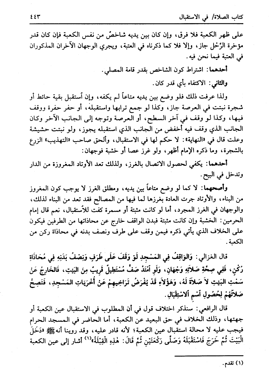 قال الغزالي: وَالوَاقِفُ فِي المَسْجِدِ لَوْ وَقَفَ عَلَى طَرَفٍ وَنصْفُ بَدَنِهِ فِي مُحَاذَاةِ رُكْنٍ، فَفِي صِحَّةِ صَلاَتِهِ وَجْهَانِ، وَلَوِ امْتَدَّ صَفٌّ مُسْتَطِيلٌ قَرِيبٌ مِنَ البَيْتِ، فَالخَارجُ عَنْ سَمْتِ البَيْتِ لاَ صَلاةَ لَهُ، وَهَؤُلاَءِ قَد يُفْرَضُ تَرَاخِيهِمْ عَنْ أُخْرَيَاتِ المَسْجِدِ، فَتَصِحُّ صَلاتُهُمْ لِحُصُولِ اسْمِ الاسْتِقْبَالِ.