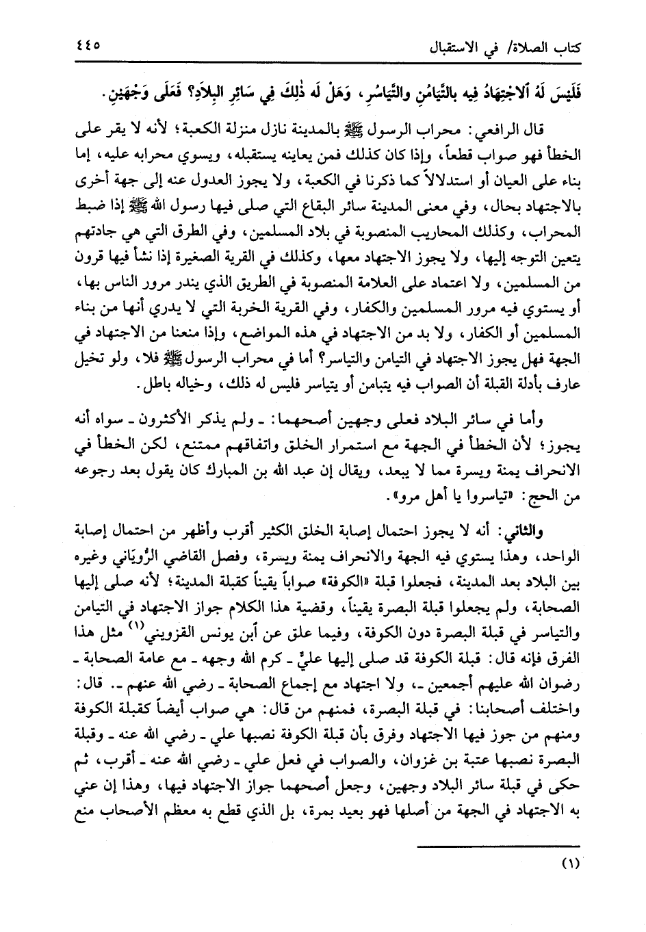 والثاني: أنه لا يجوز احتمال إصابة الخلق الكثير أقرب وأظهر من احتمال إصابة الواحد، وهذا يستوي فيه الجهة والانحراف يمنة ويسرة، وفصل القاضي الرُّويَاني وغيره بين البلاد بعد المدينة، فجعلوا قبلة "الكوفة" صواباً يقيناً كقبلة المدينة؛ لأنه صلى إليها الصحابة، ولم يجعلوا قبلة البصرة يقيناً، وقضية هذا الكلام جواز الاجتهاد في التيامن والتياسر في قبلة البصرة دون الكوفة، وفيما علق عن ابن يونس القزويني (¬1) مثل هذا الفرق فإنه قال: قبلة الكوفة قد صلى إليها عليٌّ -كرم الله وجهه- مع عامة الصحابة -رضوان الله عليهم أجمعين-، ولا اجتهاد مع إجماع الصحابة -رضي الله عنهم-. قال: واختلف أصحابنا: في قبلة البصرة، فمنهم من قال: هي صواب أيضاً كقبلة الكوفة ومنهم من جوز فيها الاجتهاد وفرق بأن قبلة الكوفة نصبها علي -رضي الله عنه- وقبلة البصرة نصبها عتبة بن غزوان، والصواب في فعل علي -رضي الله عنه- أقرب، ثم حكى في قبلة سائر البلاد وجهين، وجعل أصحهما جواز الاجتهاد فيها، وهذا إن عني به الاجتهاد في الجهة من أصلها فهو بعيد بمرة، بل الذي قطع به معظم الأصحاب منع