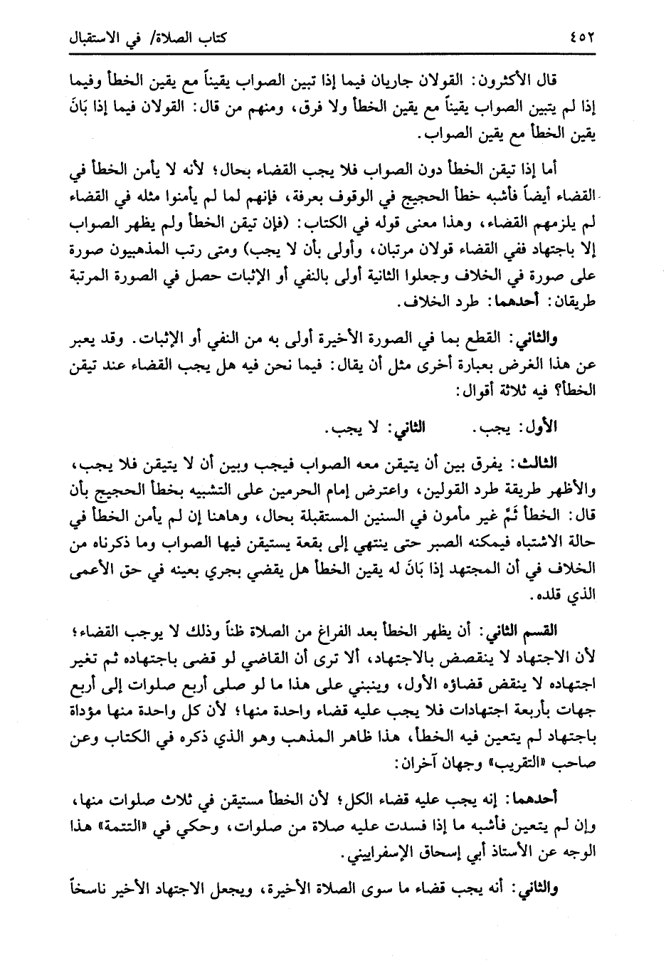 والثاني: القطع بما في الصورة الأخيرة أولى به من النفي أو الإثبات. وقد يعبر عن هذا الغرض بعبارة أخرى مثل أن يقال: فيما نحن فيه هل يجب القضاء عند تيقن الخطأ؟ فيه ثلاثة أقوال: