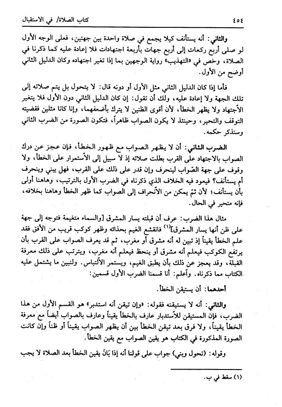 مثال هذا الضرب: عرف أن قبلته يسار المشرق [والسماء متغيمة فتوجه إلى جهة على ظن أنها يسار المشرق] (¬1) فانقشع الغيم بحذائه وظهر كوكب قريب من الأفق فقد علم الخطأ يقينًا إذ تبين له أنه مشرق أو مغرب، ثم قد يعرف الصواب على القرب بأن يرتفع الكوكب فيعلم أنه مشرق أو ينحظ فيعلم أنه مغرب، ويترتب على ذلك معرفة القبلة، وقد يعجز عن ذلك بأن يطبق الغيم، ويستمر الالتباس. ولنبين ما يشتمل عليه الكتاب مما ذكرناه. واعلم: أنا قسمنا الضرب الأول قسمين: