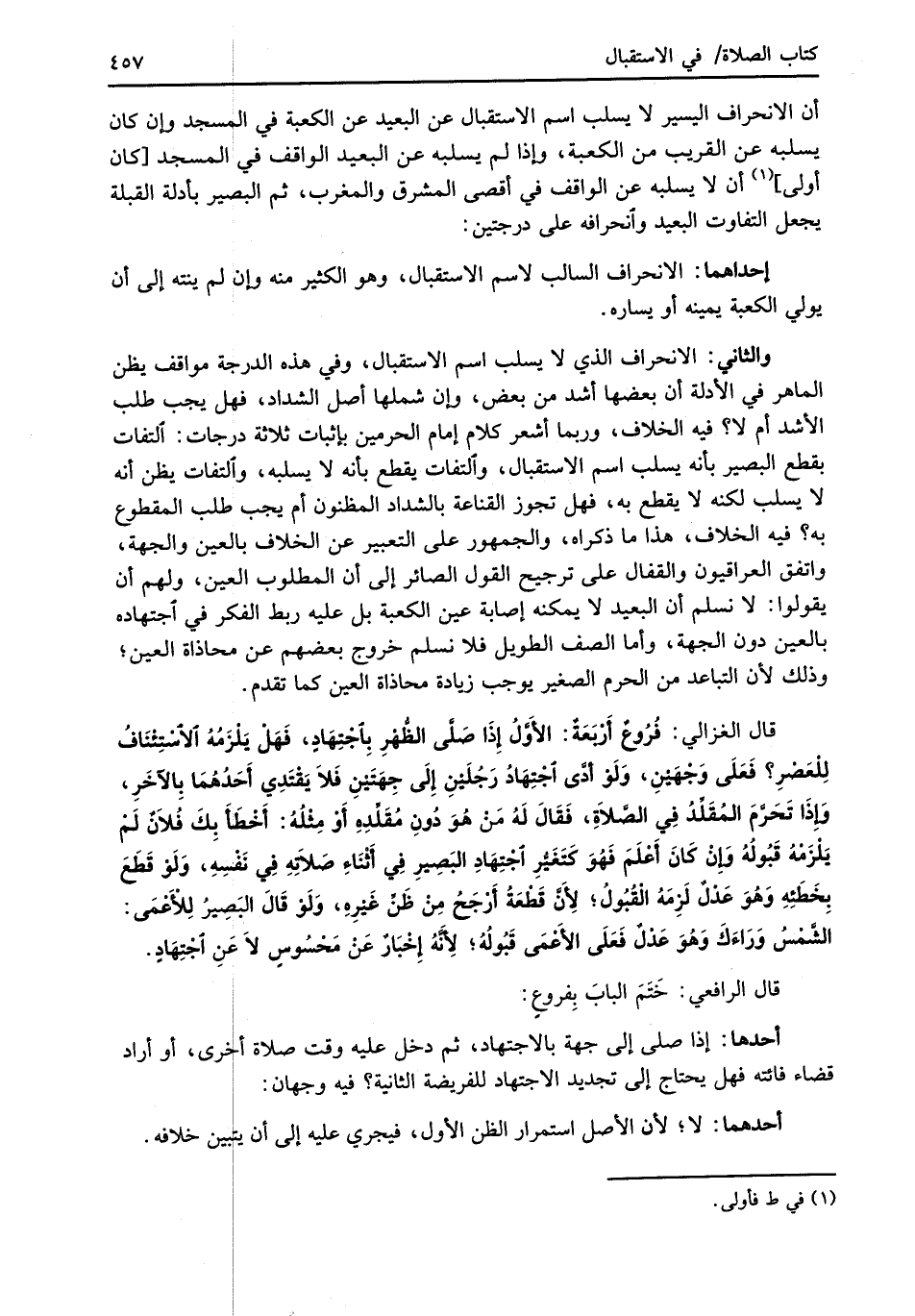 والثاني: الانحراف الذي لا يسلب اسم الاستقبال، وفي هذه الدرجة مواقف يظن الماهر في الأدلة أن بعضها أشد من بعض، وإن شملها أصل الشداد، فهل يجب طلب الأشد أم لا؟ فيه الخلاف، وربما أشعر كلام إمام الحرمين بإثبات ثلاثة درجات: التفات بقطع البصير بأنه يسلب اسم الاستقبال، والتفات يقطع بأنه لا يسلبه، والتفات يظن أنه لا يسلب لكنه لا يقطع به، فهل تجوز القناعة بالشداد المظنون أم يجب طلب المقطوع به؟ فيه الخلاف، هذا ما ذكراه، والجمهور على التعبير عن الخلاف بالعين والجهة، واتفق العراقيون والقفال على ترجيح القول الصائر إلى أن المطلوب العين، ولهم أن يقولوا: لا نسلم أن البعيد لا يمكنه إصابة عين الكعبة بل عليه ربط الفكر في اجتهاده بالعين دون الجهة، وأما الصف الطويل فلا نسلم خروج بعضهم عن محاذاة العين؛ وذلك لأن التباعد من الحرم الصغير يوجب زيادة محاذاة العين كما تقدم.