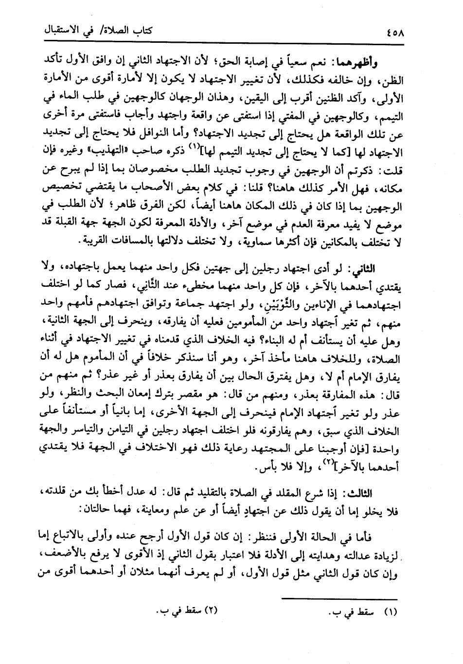 وأظهرهما: نعم سعياً في إصابة الحق؛ لأن الاجتهاد الثاني إن وافق الأول تأكد الظن، وإن خالفه فكذلك، لأن تغيير الاجتهاد لا يكون إلا لأمارة أقوى من الأمارة الأولى، وآكد الظنين أقرب إلى اليقين، وهذان الوجهان كالوجهين في طلب الماء في التّيمم، وكالوجهين في المفتي إذا استفتى عن واقعة واجتهد وأجاب فاستفتى مرة أخرى عن تلك الواقعة هل يحتاج إلى تجديد الاجتهاد؟ وأما النوافل فلا يحتاج إلى تجديد الاجتهاد لها [كما لا يحتاج إلى تجديد التّيمم لها] (¬1) ذكره صاحب "التهذيب" وغيره فإن قلت: ذكرتم أن الوجهين في وجوب تجديد الطلب مخصوصان بما إذا لم يبرح عن مكانه، فهل الأمر كذلك هاهنا؟ قلنا: في كلام بعض الأصحاب ما يقتضي تخصيص الوجهين بما إذا كان في ذلك المكان هاهنا أيضاً، لكن الفرق ظاهر؛ لأن الطلب في موضع لا يفيد معرفة العدم في موضع آخر، والأدلة المعرفة لكون الجهة جهة القبلة قد لا تختلف بالمكانين فإن أكثرها سماوية، ولا تختلف دلالتها بالمسافات القريبة.