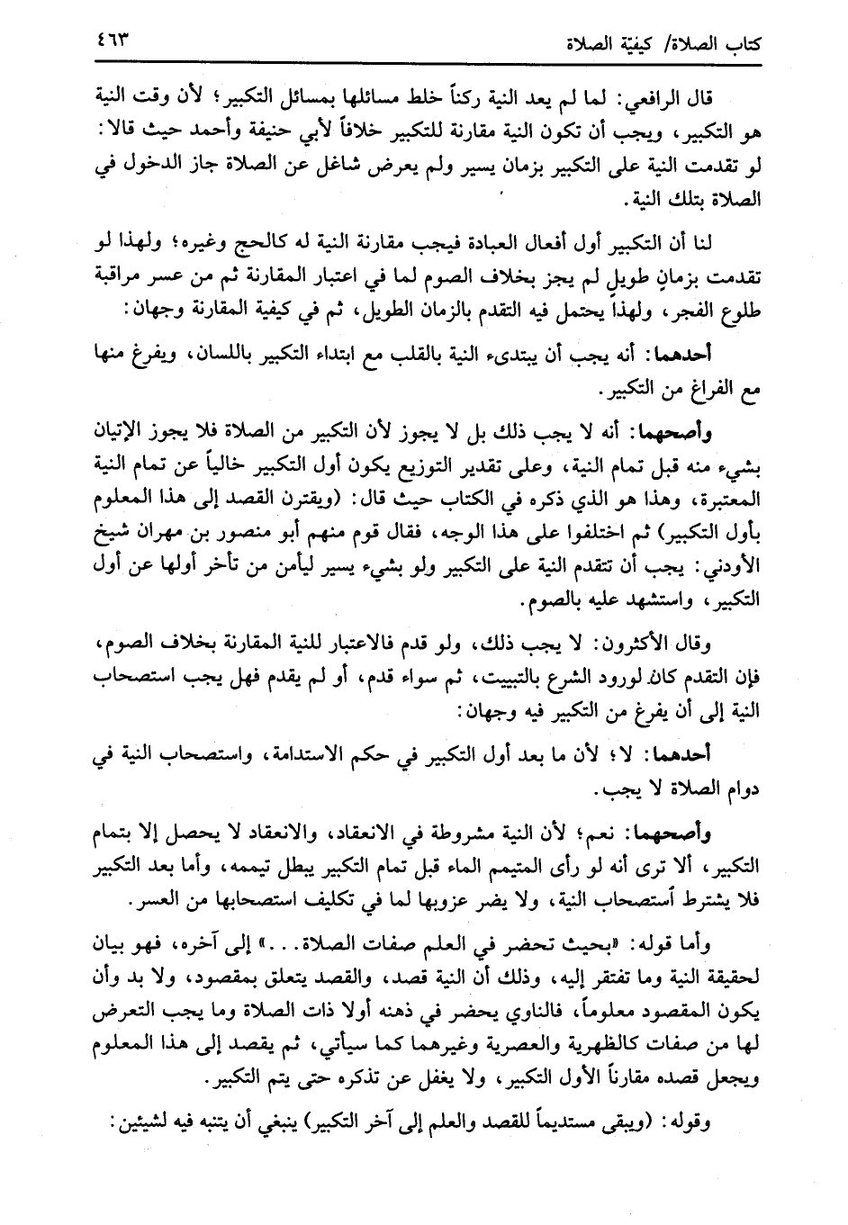 قال الرافعي: لما لم يعد النية ركنًا خلط مسائلها بمسائل التكبير؛ لأن وقت النية هو التكبير، ويجب أن تكون النية مقارنة للتكبير خلافاً لأبي حنيفة وأحمد حيث قالا: لو تقدمت النية على التكبير بزمان يسير ولم يعرض شاغل عن الصلاة جاز الدخول في الصلاة بتلك النية.